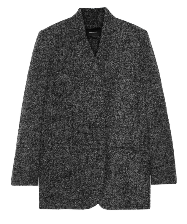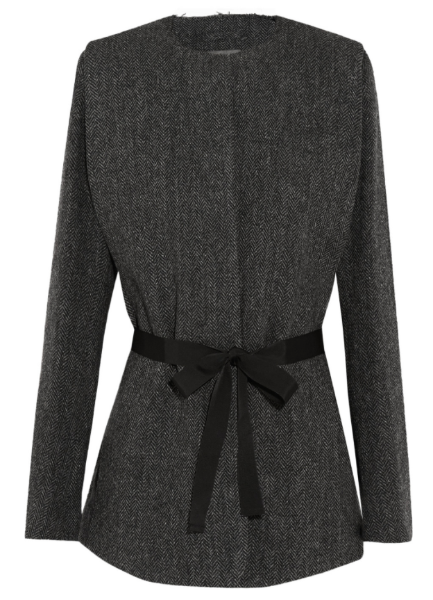 The grosgrain ties pull in what shape you might lose from a slightly oversized blazer. You can copy Emmanuelle Alt‘s own trick of belting her jackets for a little more shape. And then also copy it with a pair of skinny jeans, a low-key shoe, and a scarf in a slightly darker shade of grey.