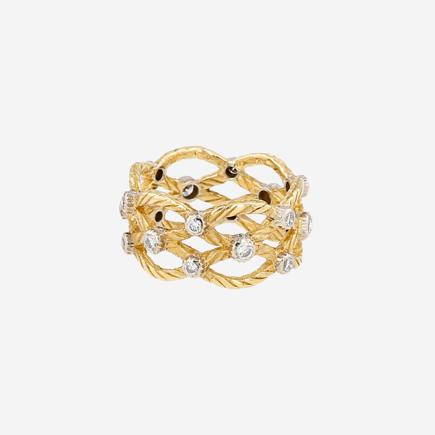 Bague Buccellati en or jaune, en or blanc, et en diamants, composée d'une élégante monture mouvementée ciselée en or jaune, ornée d'une succession de petits diamants de taille brillant pesant au total 0.20 carat finement sertis clos sur or blanc.