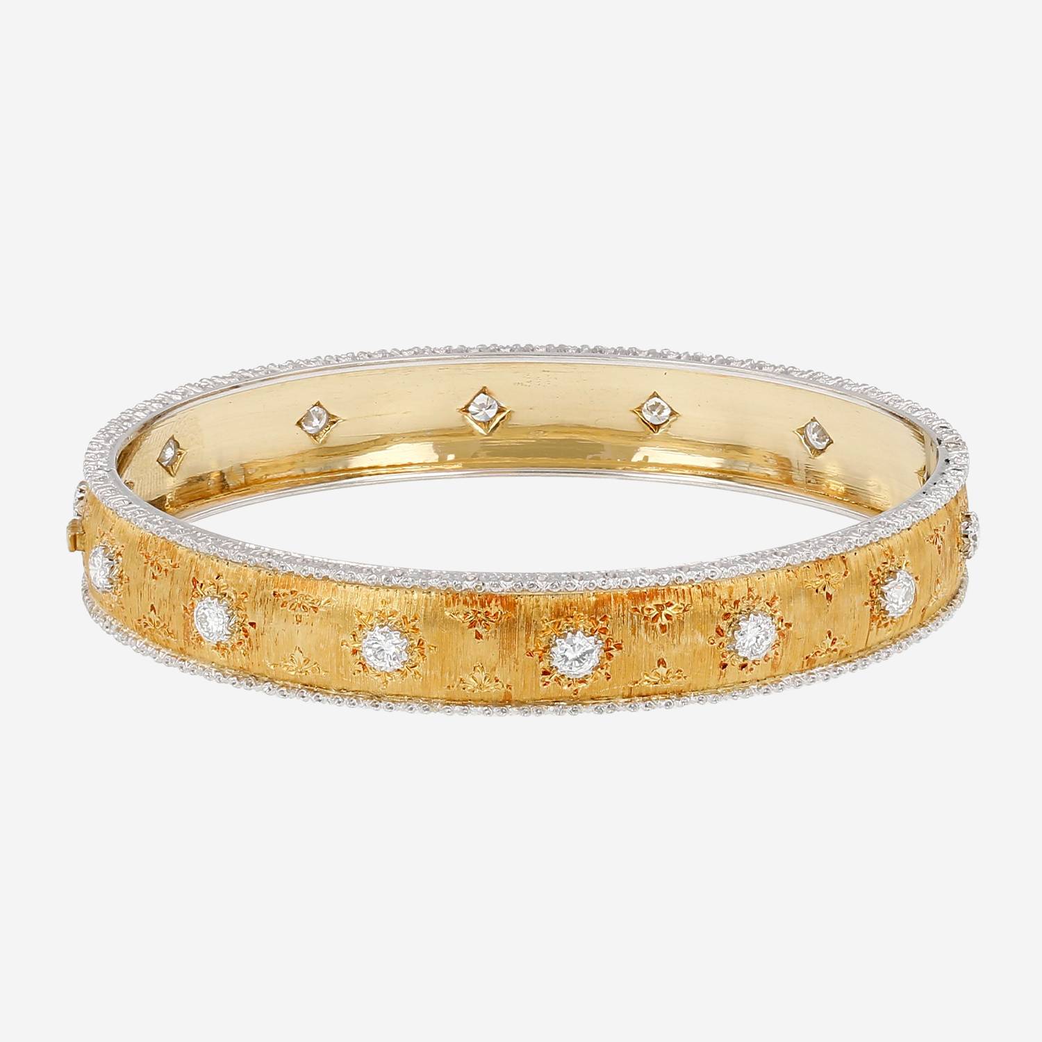 Bracelet Buccellati Macri en or jaune, en or blanc, et en diamants, composé d'un jonc texturé en or jaune, en or blanc, orné d'un décor gravé, réhaussé de diamants de taille brillant environ 1.40 carat.