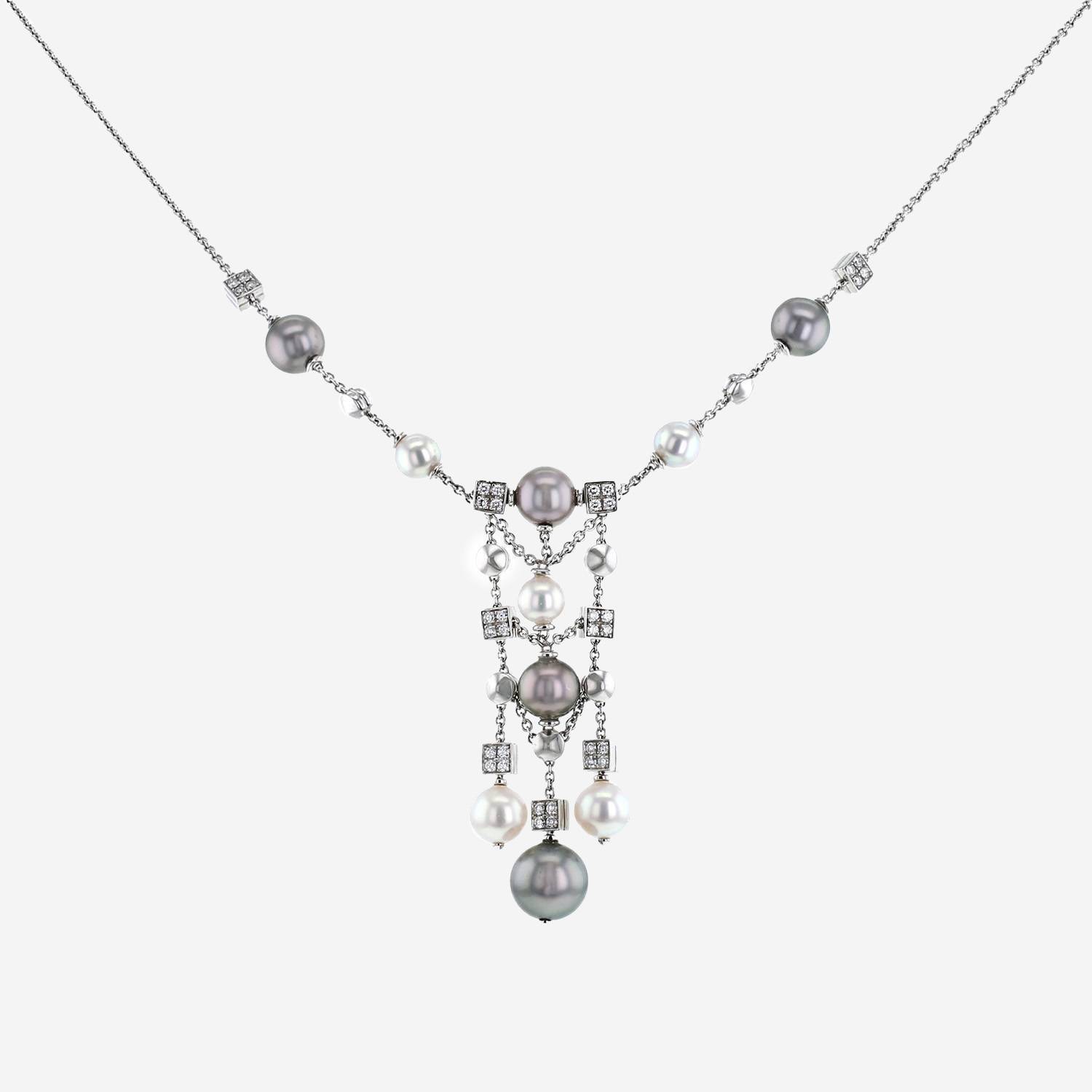 Collier Bulgari Lucéa en or blanc, en perles de culture, et en diamants, composé d'une alternance de motifs carrés délicatement pavés de diamants de taille brillant, de motifs ronds et de perles de culture grises et banches, le tout retenu par une belle chaine en or blanc.