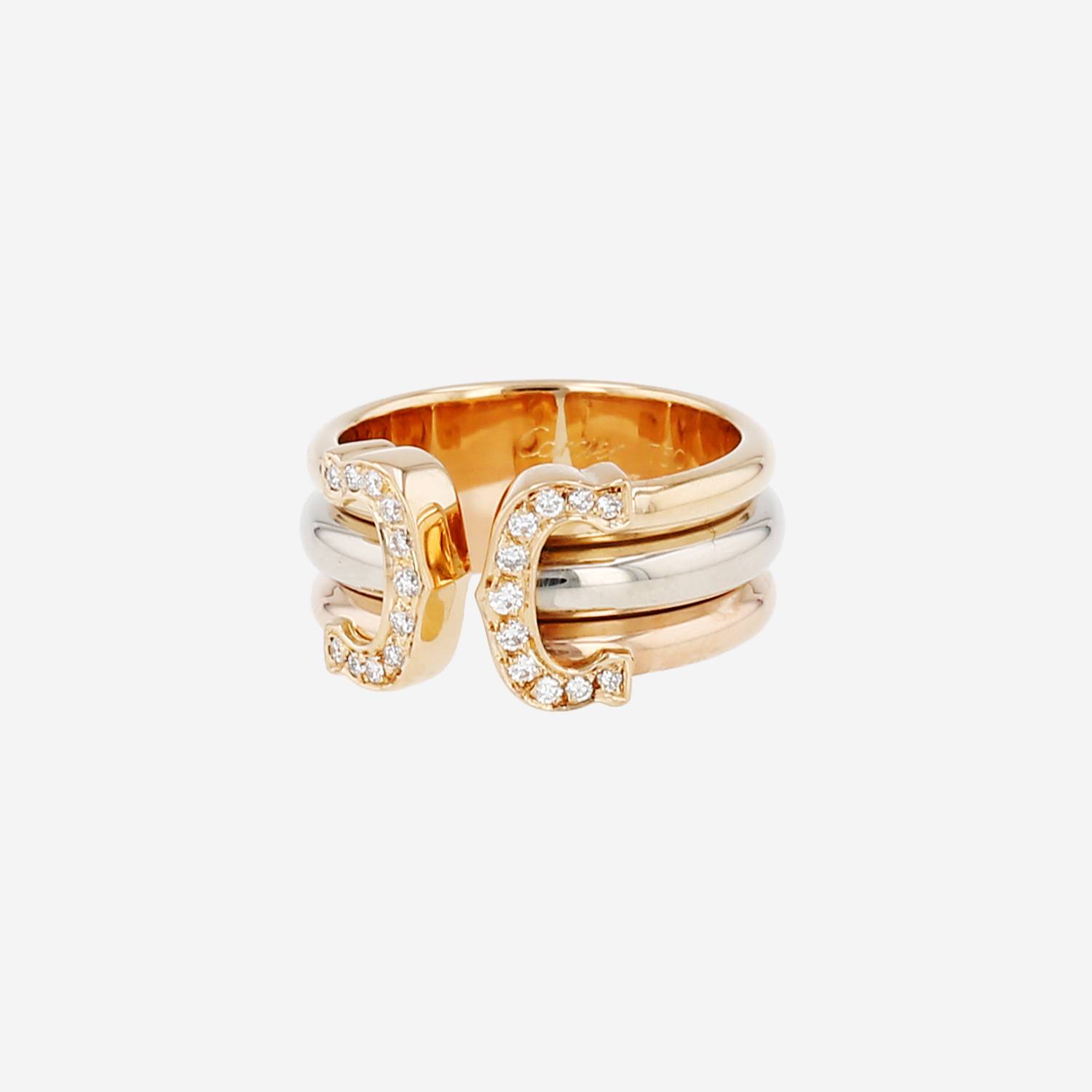 Bague Cartier C de Cartier grand modèle en 3 ors et diamants, composée d'un important bandeau godronné en or jaune, en or blanc et en or rose, réhaussée aux extremités de lettres C délicatement serties de diamants de taille brillant.