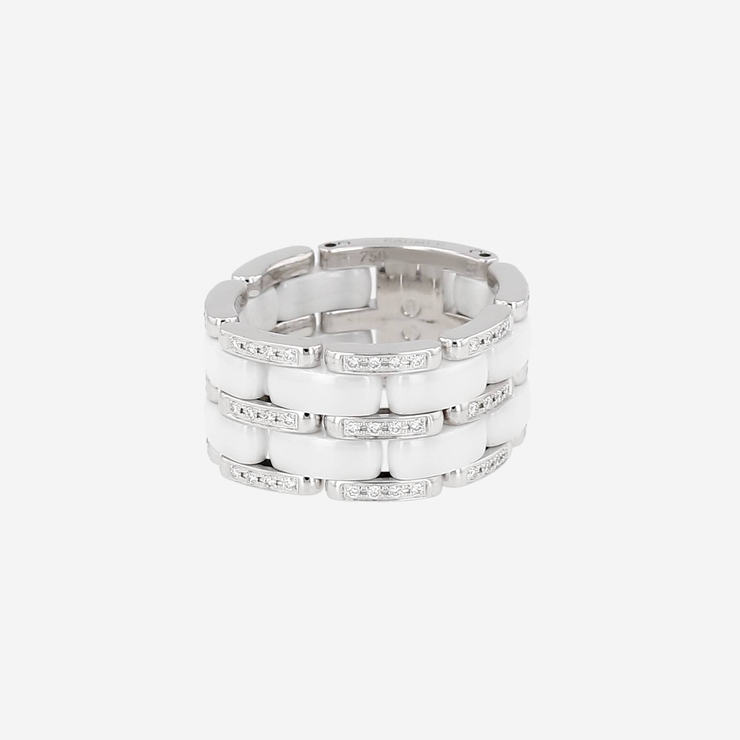 Bague souple Chanel Ultra grand modèle en or blanc, en céramique, et en diamants, composée d'une alternance de délicats maillons bombés en céramique blanche, réhaussée de très beaux maillons lisses en or blanc délicatement sertis de diamants de taille brillant.