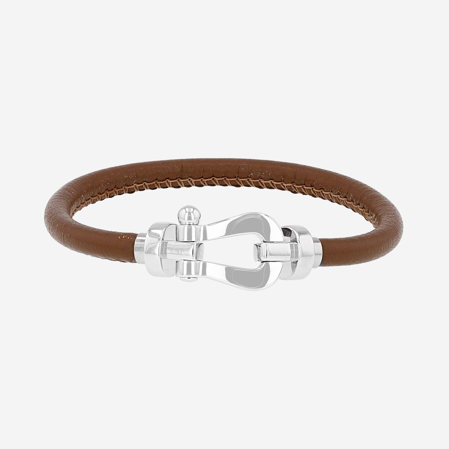 Bracelet Fred Force 10 grand modèle en or blanc, composé de l'indémodable manille géométrique ajourée en or blanc, réhaussé d'un beau cable torsadé en acier et d'un cable en cuir brun.