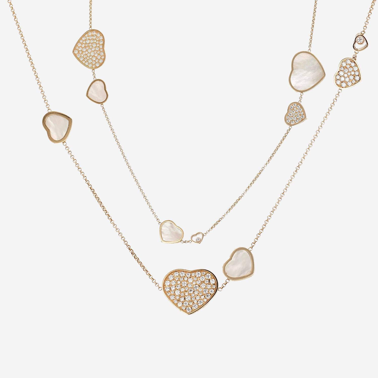 Chopard Happy Hearts long necklace in pink gold, in mother of pearl (Turbo Marmoratus), and in diamonds, composed of an alternating of hearts in pink gold set with of brilliant cut diamonds and of hearts in mother of pearl (Turbo Marmoratus), enhanced of mobile diamonds.