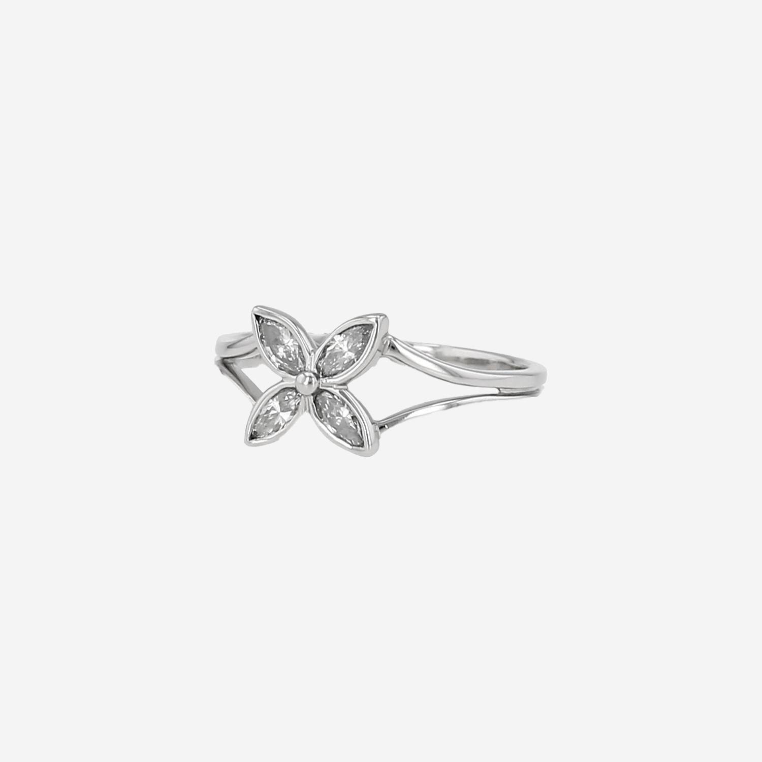 Tiffany Co Victoria ring in platinium and diamonds, composed of one ring in platinium, decorated with one lovely quadrilobed flower enhanced of a total of 0,16 carat of marquise cut diamonds.