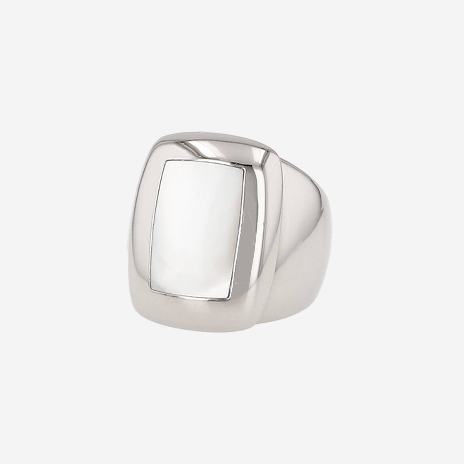 Van Cleef Arpels Babylone ring in white gold and mother of pearl (Turbo Marmoratus), composed of one important rectangular dome-shaped setting in white gold, decorated with one elegant rectangular pattern white in mother of pearl (Turbo Marmoratus).