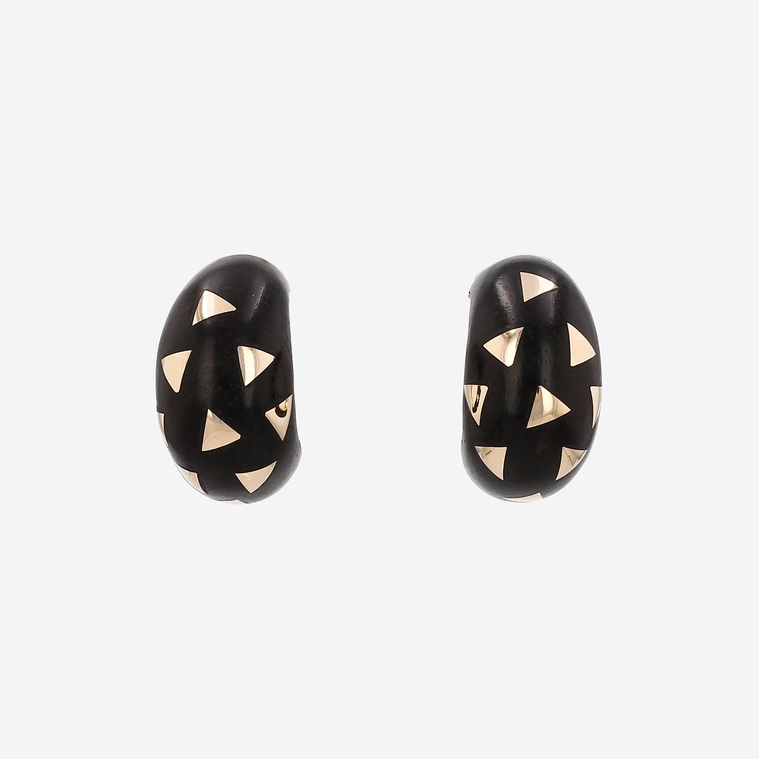 Van Cleef Arpels earrings for non pierced ears in yellow gold and ebony, composed of of dome-shaped patterns in ebony, decorated with of triangular patterns in yellow gold.