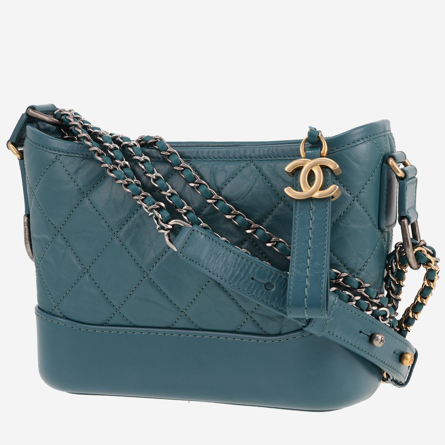 Elegant small model Chanel Gabrielle shoulder bag in green quilted leather, hardware in gilt and silver metal, double chain strap in gilt and silver metal interwoven with green leather allowing the bag to be worn on the shoulder or accross the body.