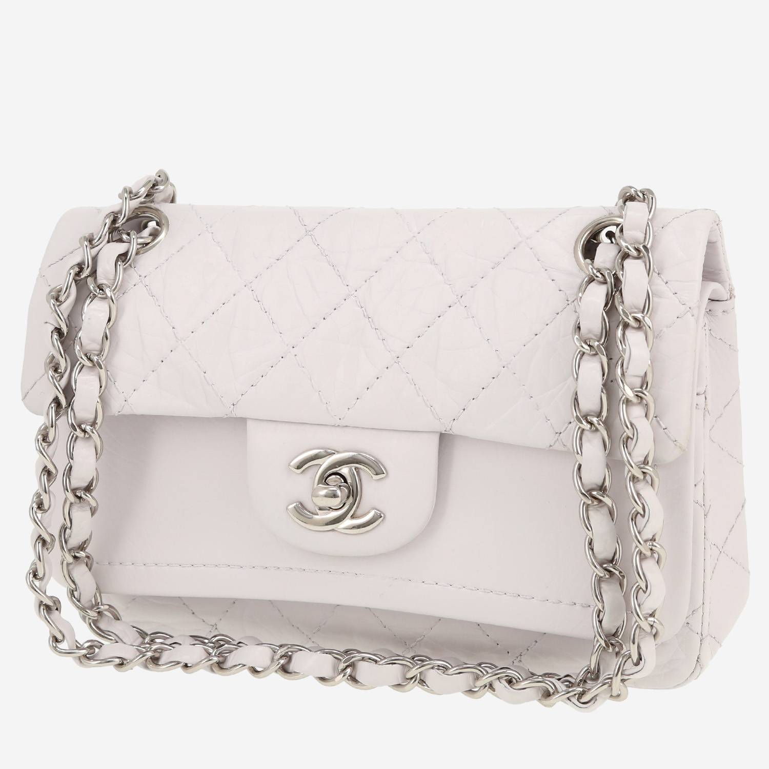 Timeless Chanel Mini Timeless shoulder bag in powder pink quilted leather, hardware in silver metal, one adjustable shoulder strap in silver metal interwoven with powder pink leather allowing the bag to be worn in the hand or on the shoulder or accross the body.