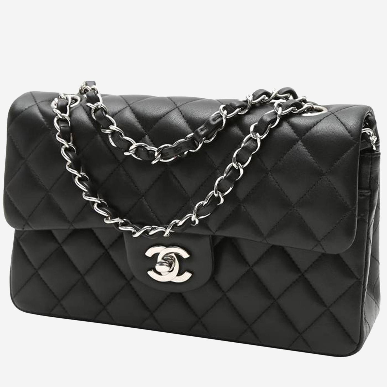 Lovely Chanel Timeless Petit shoulder bag in black quilted leather, hardware in silver metal, one convertible chain strap in silver metal interwoven with black leather allowing the bag to be worn in the hand or on the shoulder.