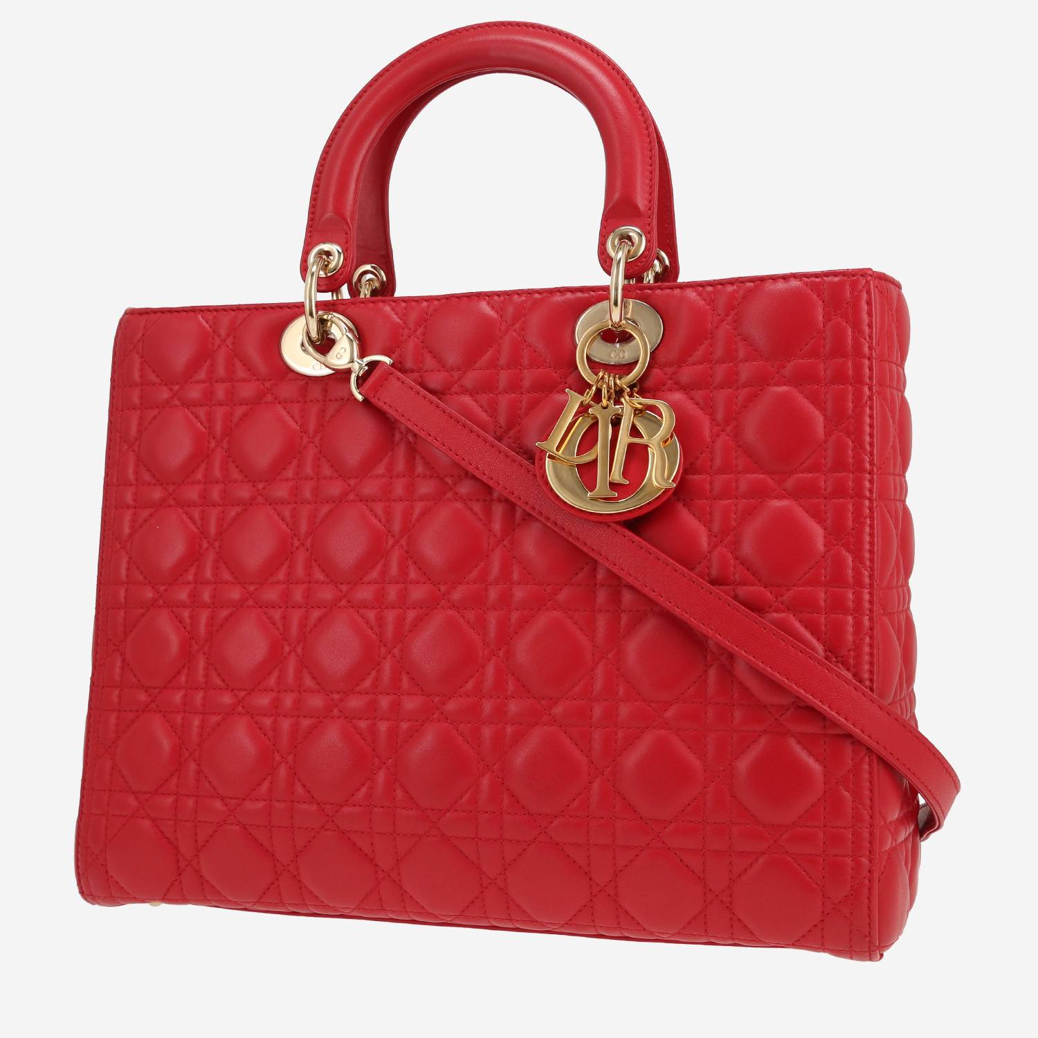 Wonderful Dior Lady Dior handbag in red leather cannage, hardware in gilt metal, double handle in red leather, red leather removable strap to be worn accross the body allowing the bag to be worn in the hand or on the shoulder.