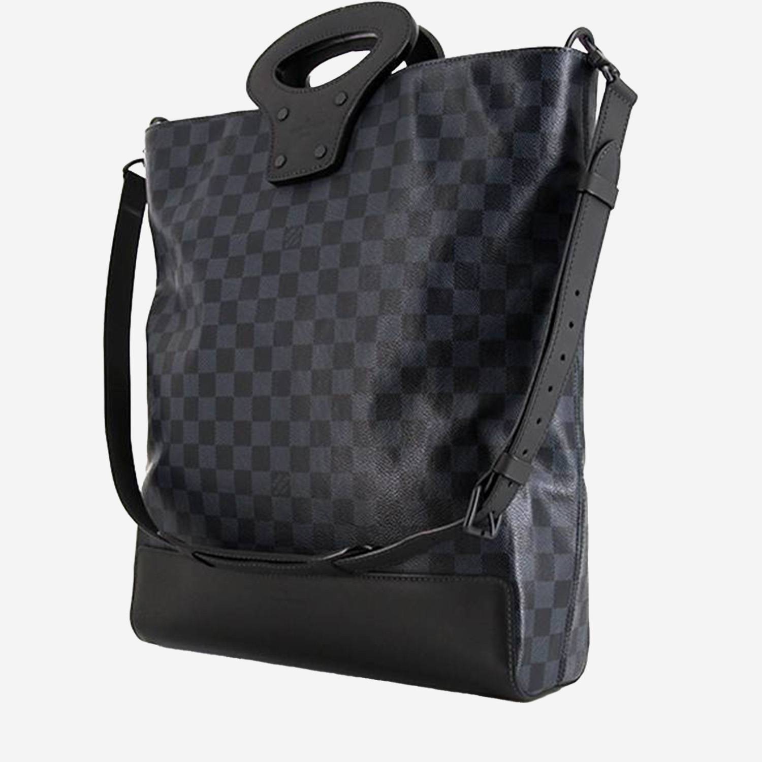 Practical Louis Vuitton North South shopping bag in damier canvas, hardware in blackened metal, double handle in black leather, one adjustable shoulder strap in black leather allowing the bag to be worn in the hand or on the shoulder or accross the body.