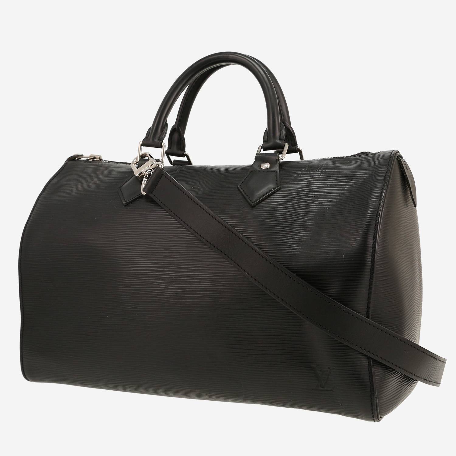Charming Louis Vuitton Speedy 35 handbag in black epi leather, hardware in silver metal, double handle in black leather, black leather adjustable and removable strap to be worn accross the body allowing the bag to be worn in the hand or on the shoulder or accross the body.