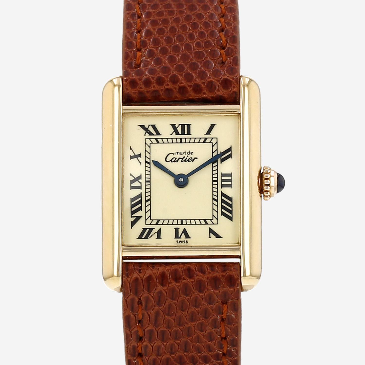 Vermeil Cartier Tank Must wristwatch. Rectangular case in vermeil, screwed caseback, crown set with a sapphire cabochon.