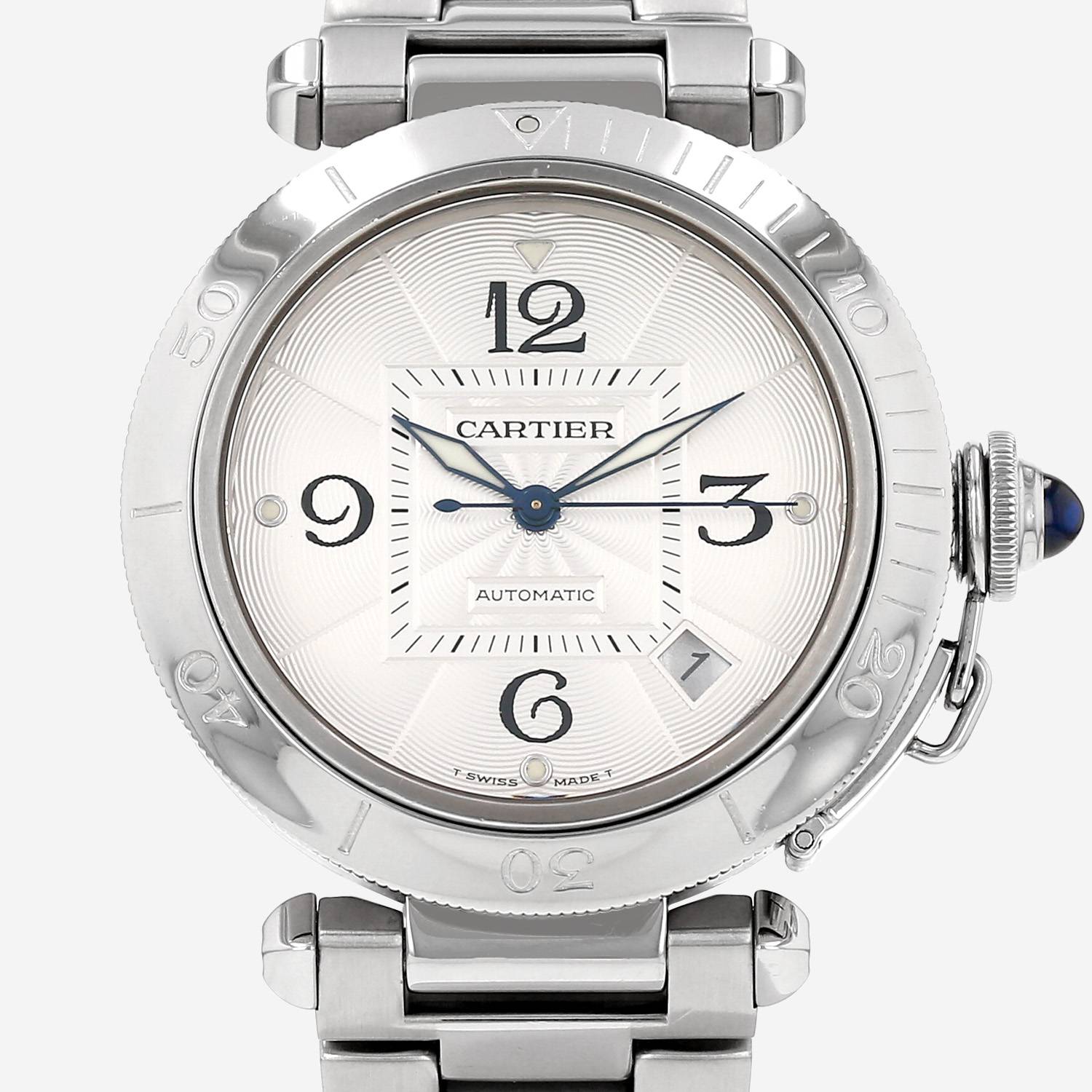 Stainless steel Cartier Pasha wristwatch. Round case in stainless steel, screwed caseback with see through movement at the back of the case, directional graduating rotating bezel, screwed crown protection set with a sapphire cabochon.