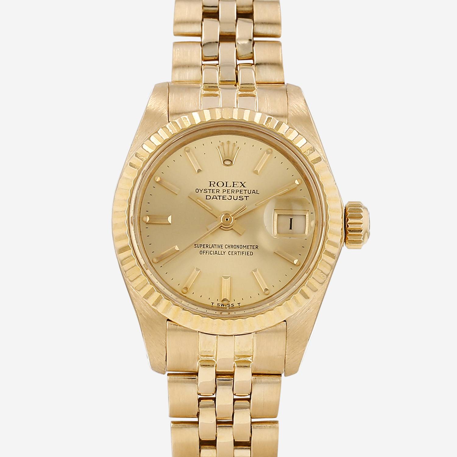Yellow gold Rolex Datejust Lady wristwatch. Round case in yellow gold, screwed caseback, striated bezel, screw-down crown.