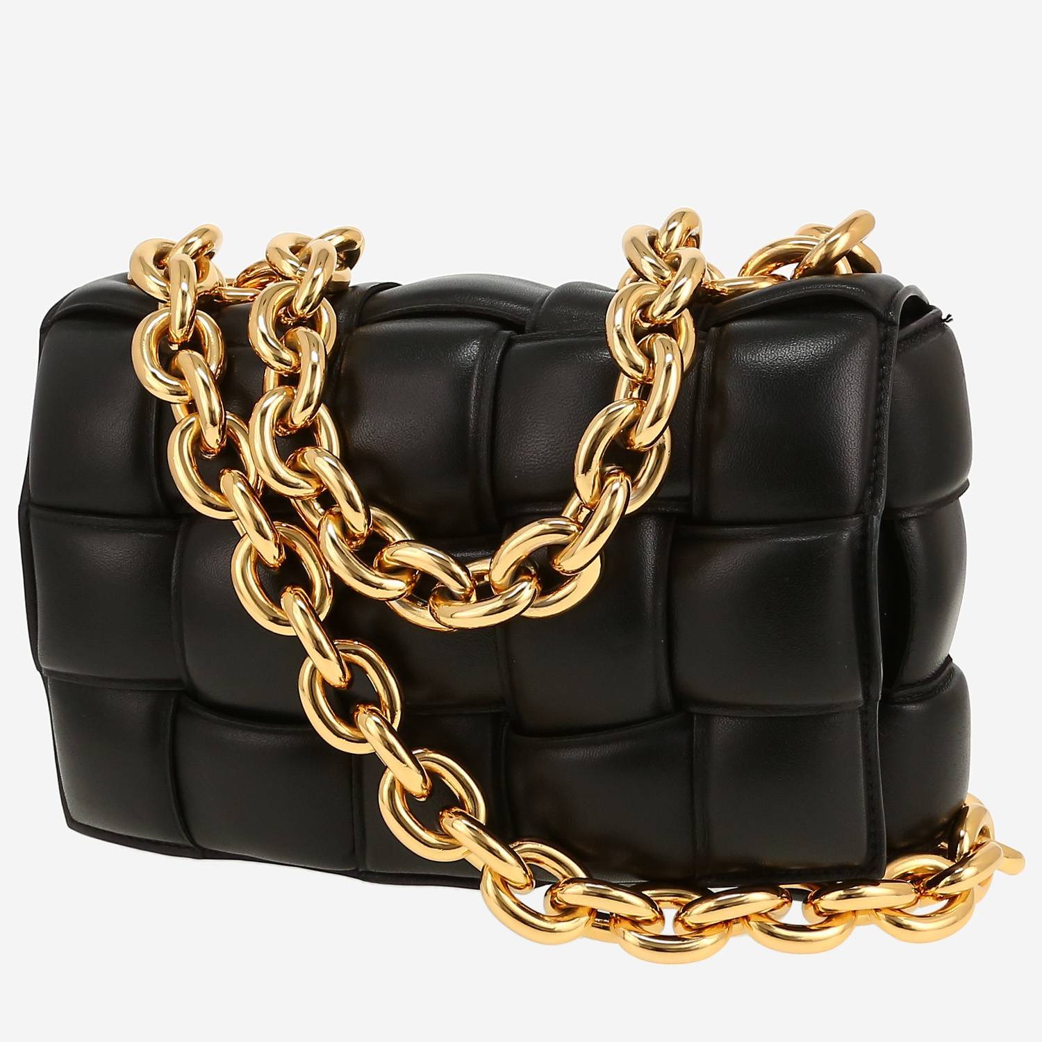 Charming Bottega Veneta Cassette shoulder bag in black intrecciato leather, hardware in gilt metal, simple handle gilt metal, one chain strap in gilt metal allowing the bag to be worn in the hand or on the shoulder or accross the body.