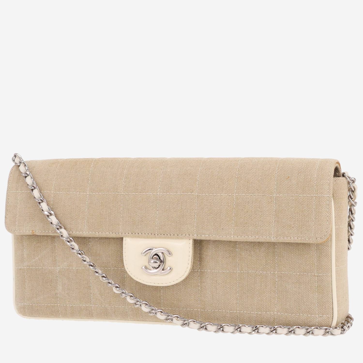 Wonderful Chanel Choco bar handbag in beige canvas, hardware in silver metal, one chain strap in silver metal interwoven with beige leather allowing the bag to be worn in the hand or on the shoulder.