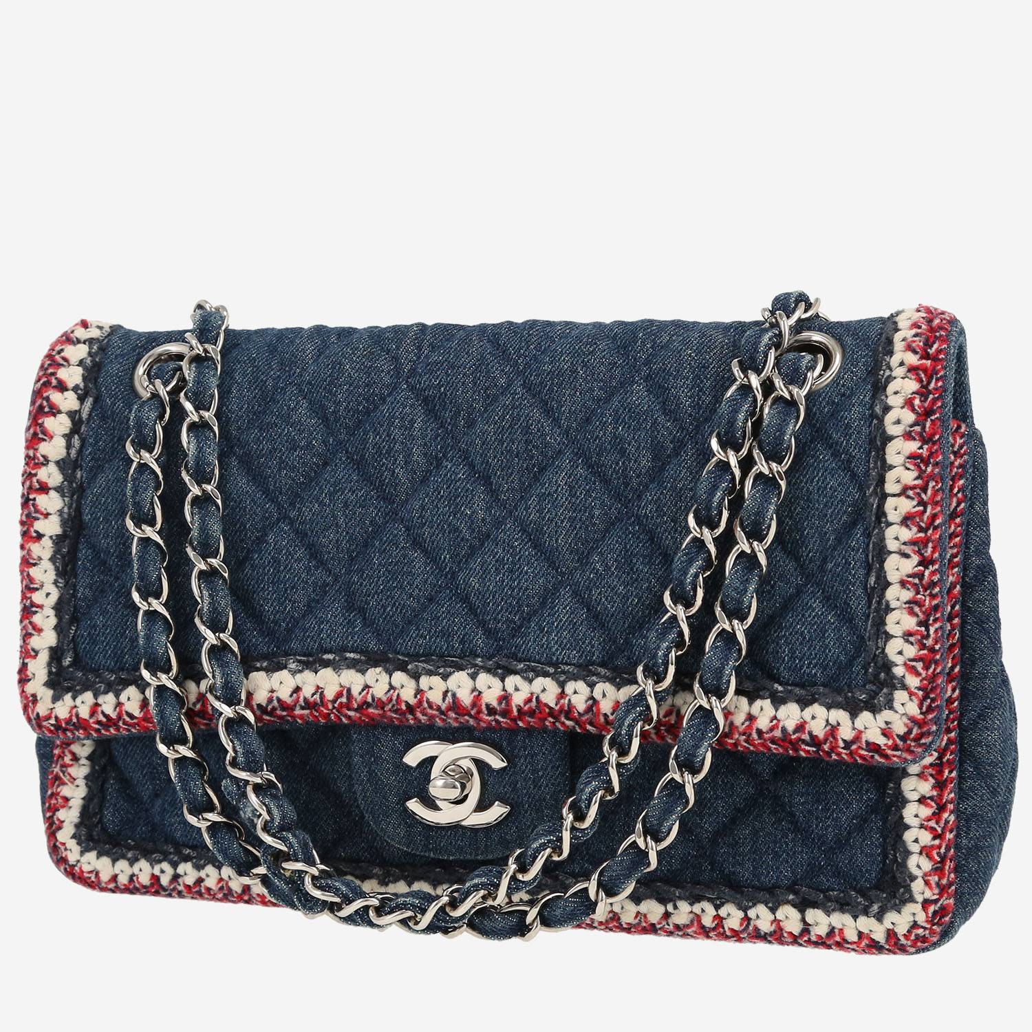 Elegant Chanel Timeless handbag in blue denim canvas, hardware in silver metal, one convertible chain strap in silver metal interwoven with blue denim canvas allowing the bag to be worn in the hand or on the shoulder.
