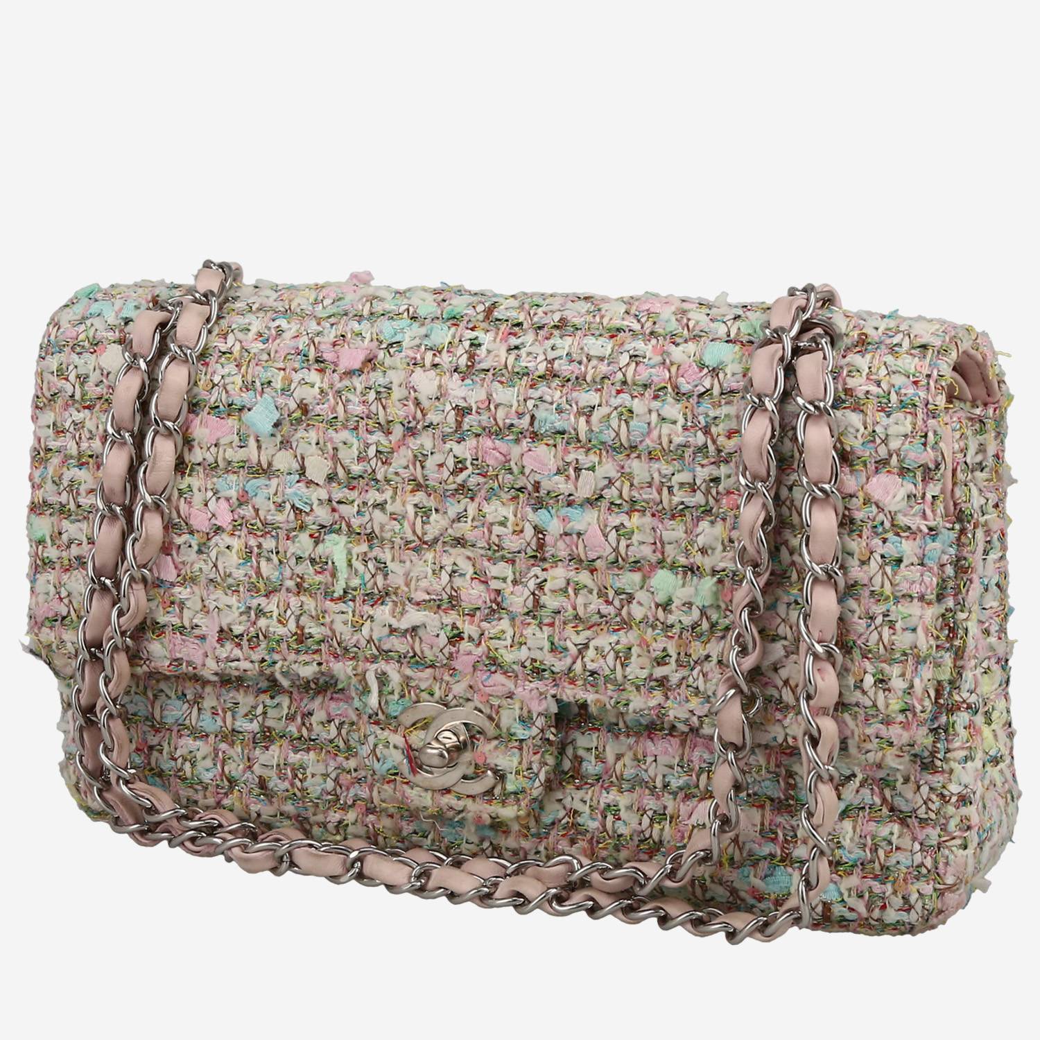 Elegant Chanel Timeless handbag in blue, green and pink tweed, hardware in silver metal, one convertible chain strap in silver metal interwoven with pink leather allowing the bag to be worn in the hand or on the shoulder.