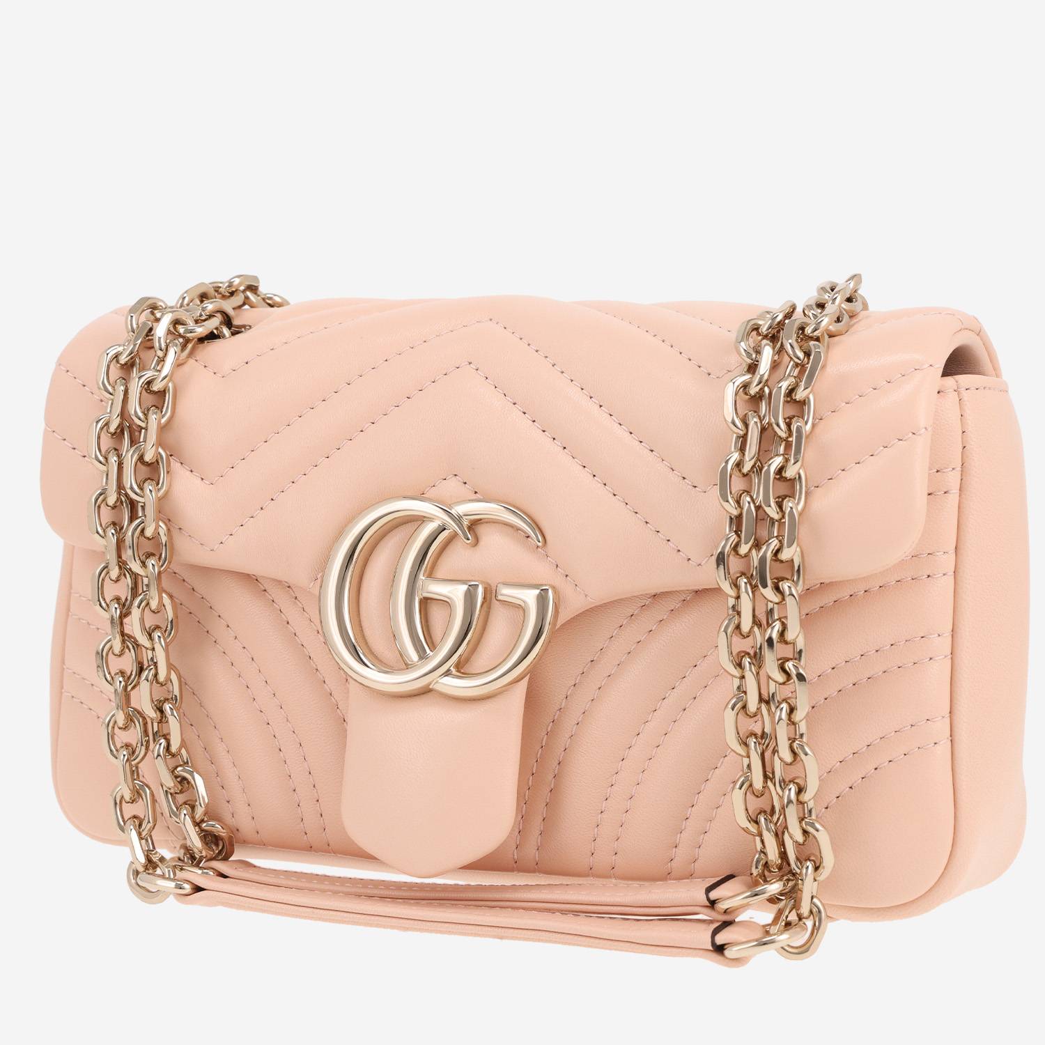 Wonderful Gucci GG Marmont shoulder bag in pink quilted leather, hardware in silver metal, double convertible chain strap in silver metal allowing the bag to be worn in the hand or on the shoulder or accross the body.