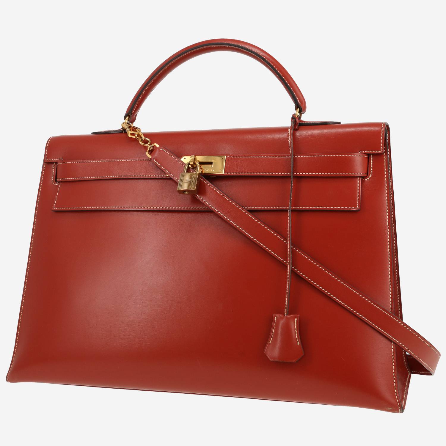 Wonderful Hermès Kelly 40 cm handbag in Rouge Pompéi box leather, hardware in gilt metal, simple handle in Rouge Pompéi leather, Rouge Pompéi leather removable strap to be worn accross the body allowing the bag to be worn in the hand or on the shoulder.
