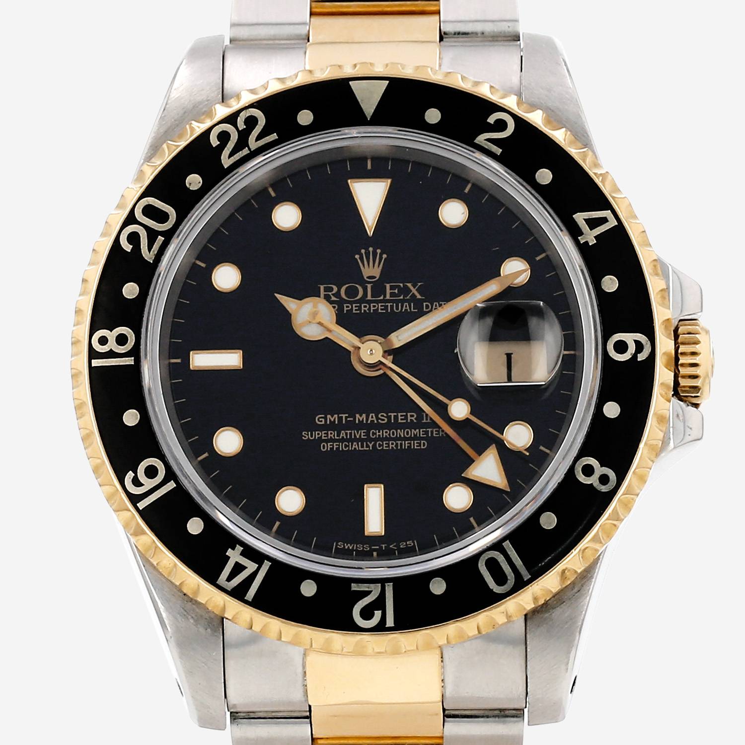 Gold and stainless steel Rolex GMT-Master II wristwatch. Round case in gold and stainless steel, screwed caseback, 24 hours graduated rotating bezel, screw-down crown.