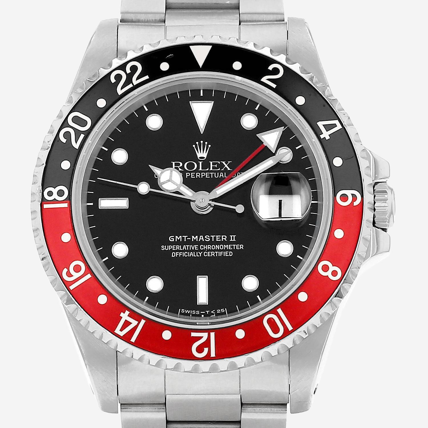 Stainless steel Rolex GMT-Master II wristwatch. Round case in stainless steel, screwed caseback, 24 hours graduated rotating bezel, screw-down crown.