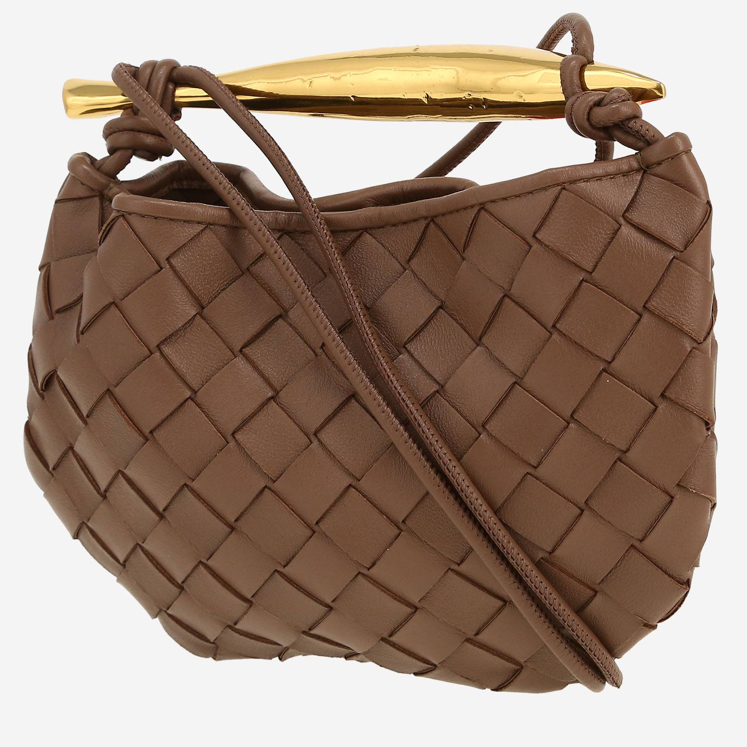 Magnífico bolso bandolera Bottega Veneta Sardine de cuero intrecciato marrón, adorno en metal dorado, asa sencilla de metal dorado, bandolera de cuero marrón para llevar en la mano o colgado al hombro o cruzado.
