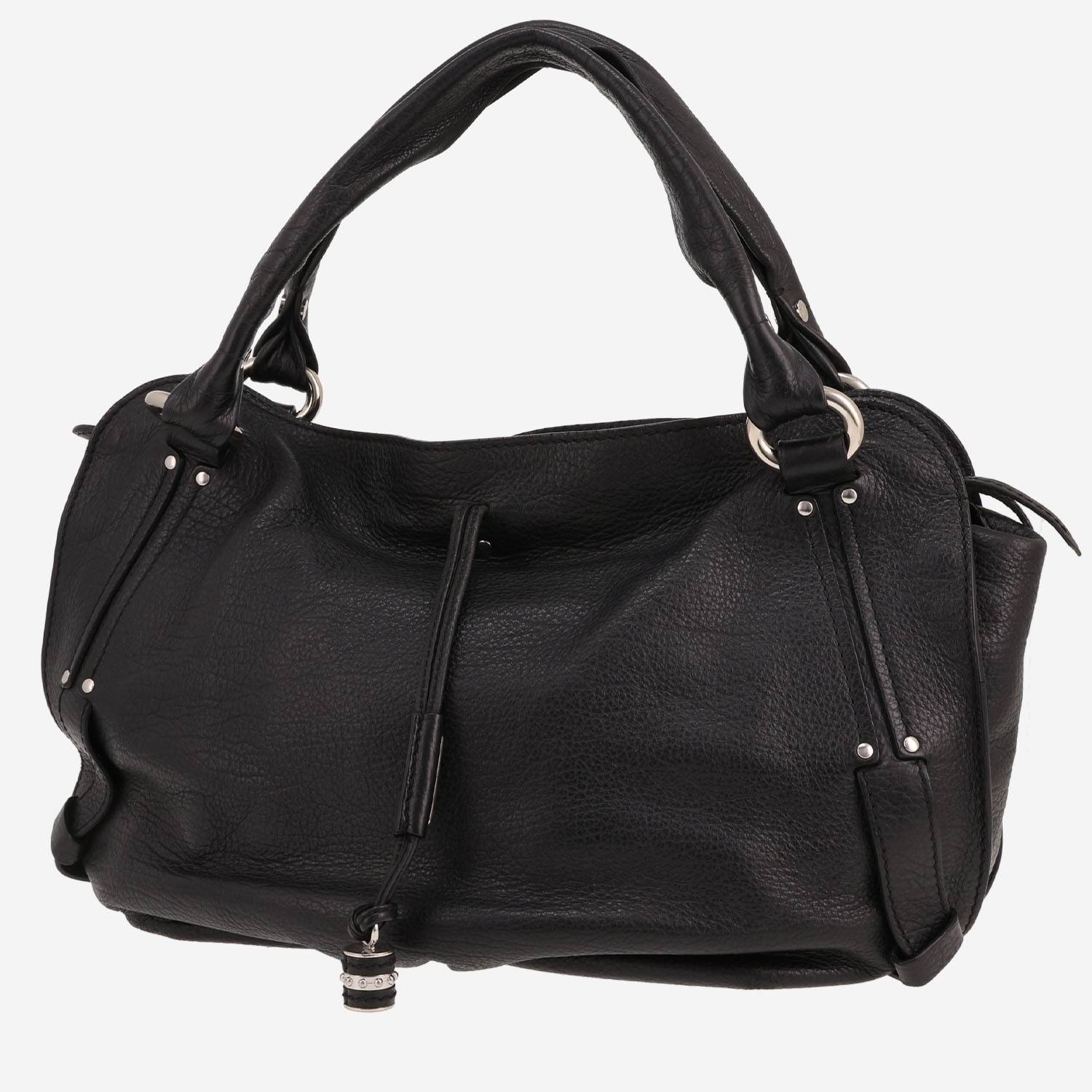 Magnífico bolso de mano Celine de cuero negro, adorno en metal plateado, doble asa de cuero negro para llevar en la mano o al hombro.