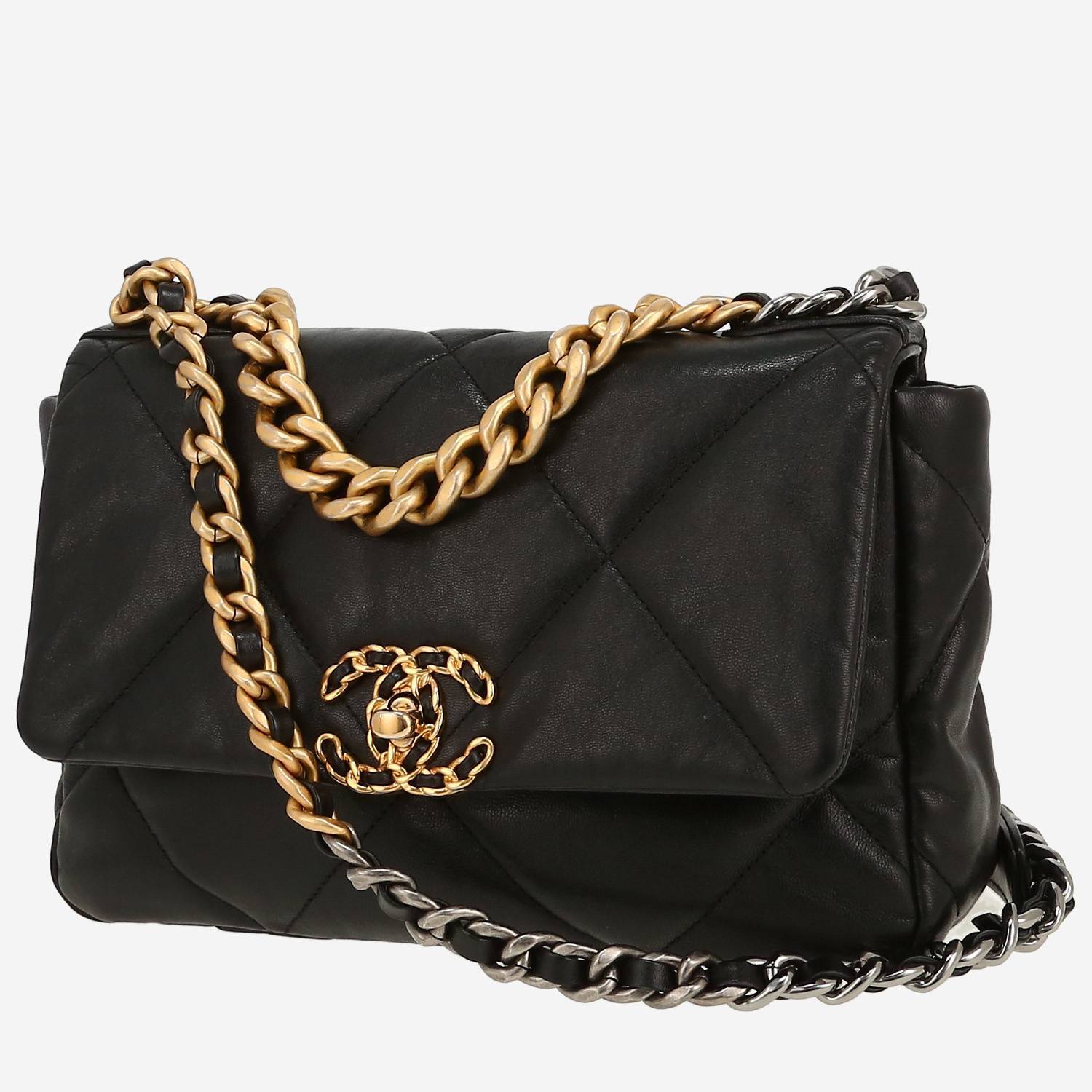 Encantador bolso bandolera Chanel 19 modelo mediano de cuero acolchado negro, adorno en metal dorado y plateado, asa de metal dorado, una asa en cadena de metal dorado y plateado entrelazada de cuero negro para llevar en la mano o colgado al hombro o cruzado.