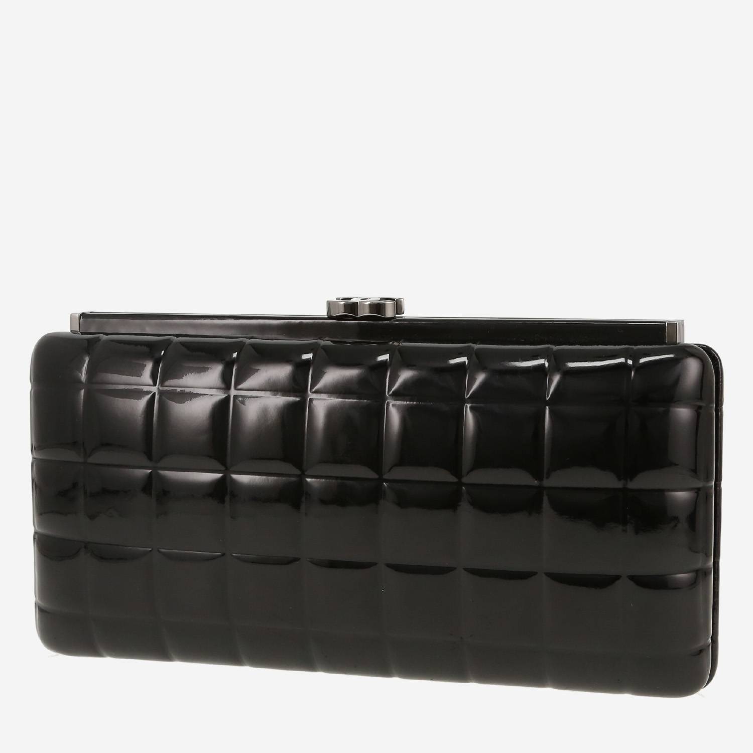 Magnífico bolsito de mano Chanel de charol acolchado negro, adorno en metal plateado.