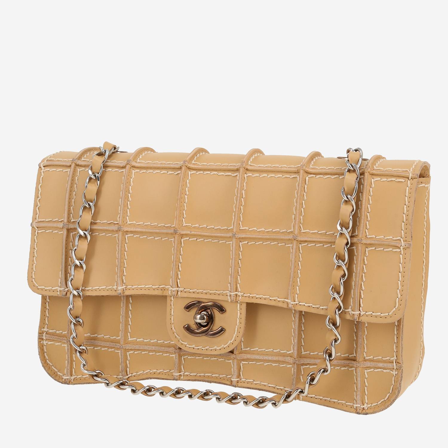 Divertido bolso de mano Chanel Timeless de cuero beige, adorno en metal plateado, una asa en cadena ajustable de metal plateado entrelazada de cuero beige para llevar en la mano o al hombro.