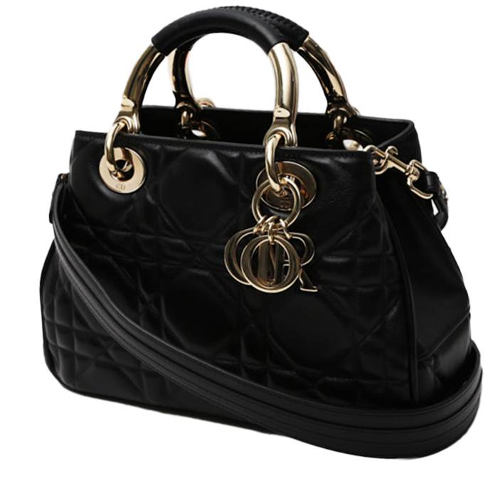Elegante bolso de mano Dior Lady 95.22 de cuero cannage negro, adorno en metal dorado, doble asa de cuero negro, bandolera extraíble de cuero negro para llevar en la mano o colgado al hombro o cruzado.