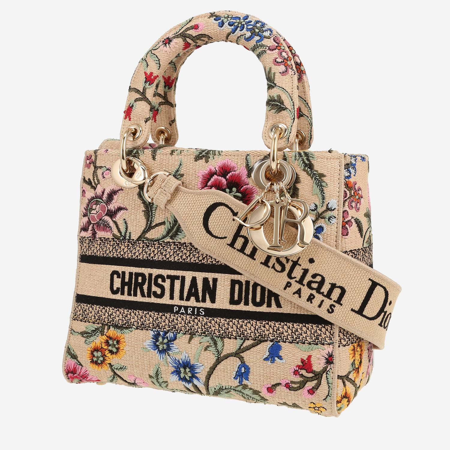 Magnífico bolso de mano Dior Lady Dior de lona beige de diseño floral, adorno en metal dorado, doble asa de lona beige, una bandolera extraíble de lona beige estampado para llevar en la mano o colgado al hombro o cruzado.