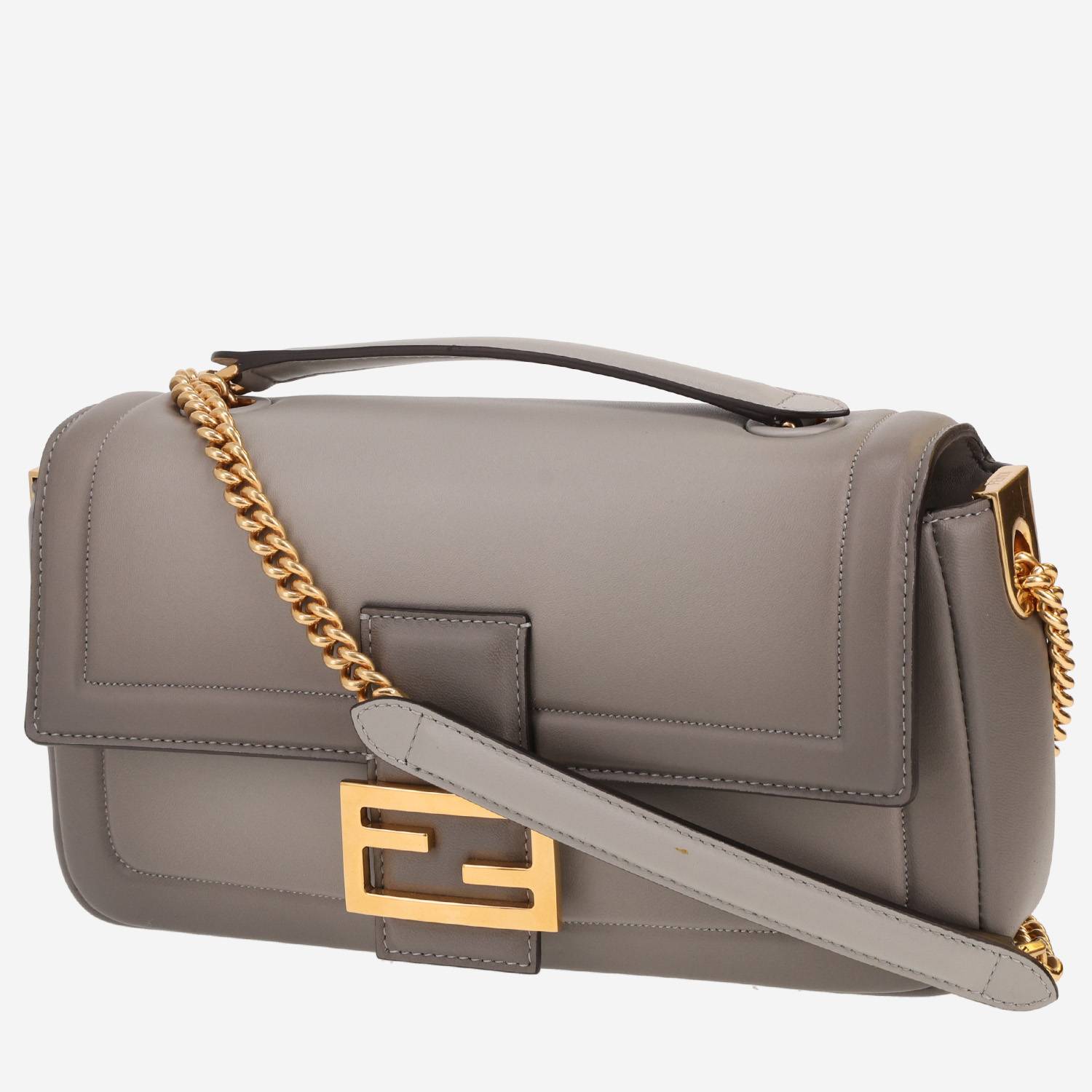 Magnífico bolso bandolera Fendi Baguette de cuero gris, adorno en metal dorado, asa sencilla de cuero gris, una asa en cadena de metal dorado para llevar en la mano o colgado al hombro o cruzado.