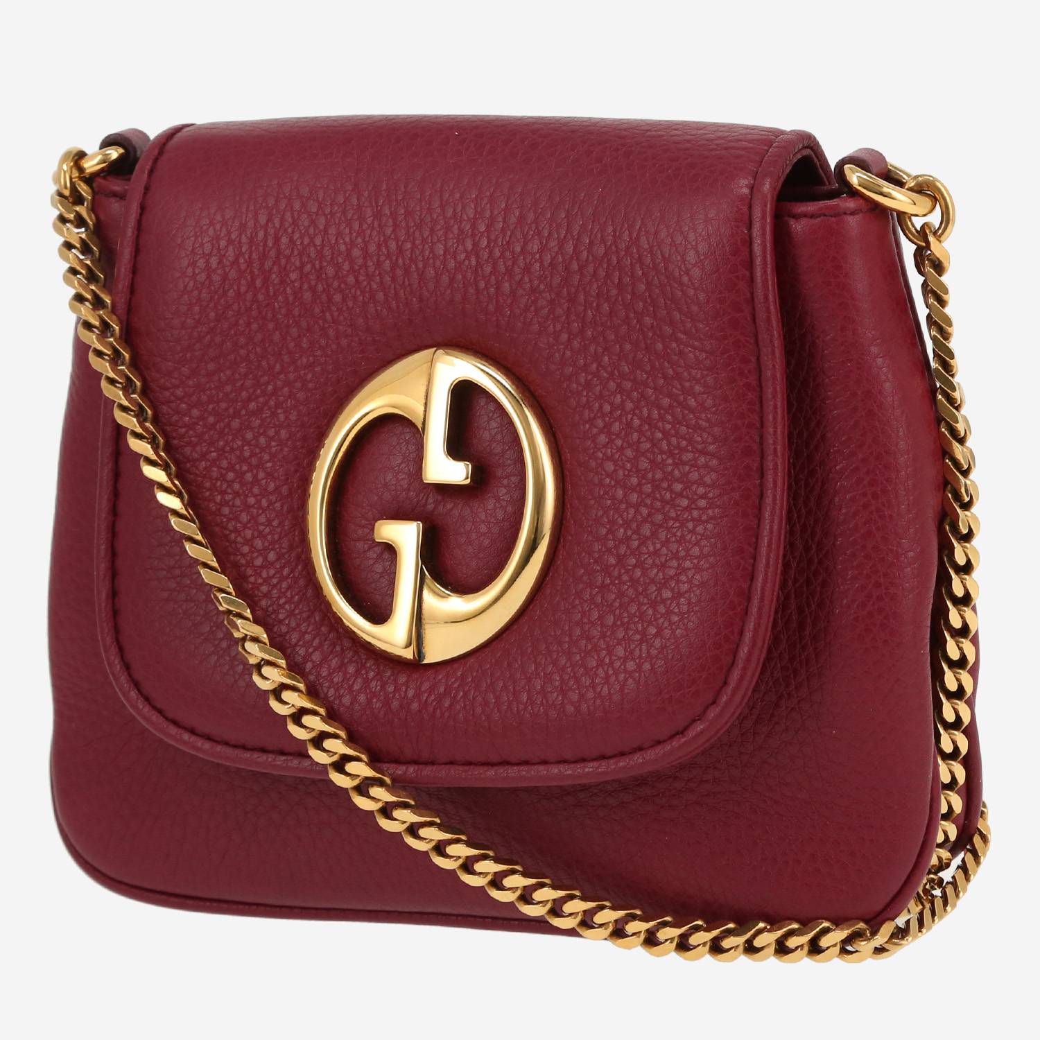 Magnífico bolso bandolera Gucci de cuero color burdeos, adorno en metal dorado, una asa en cadena de metal dorado para llevar en la mano o colgado al hombro o cruzado.
