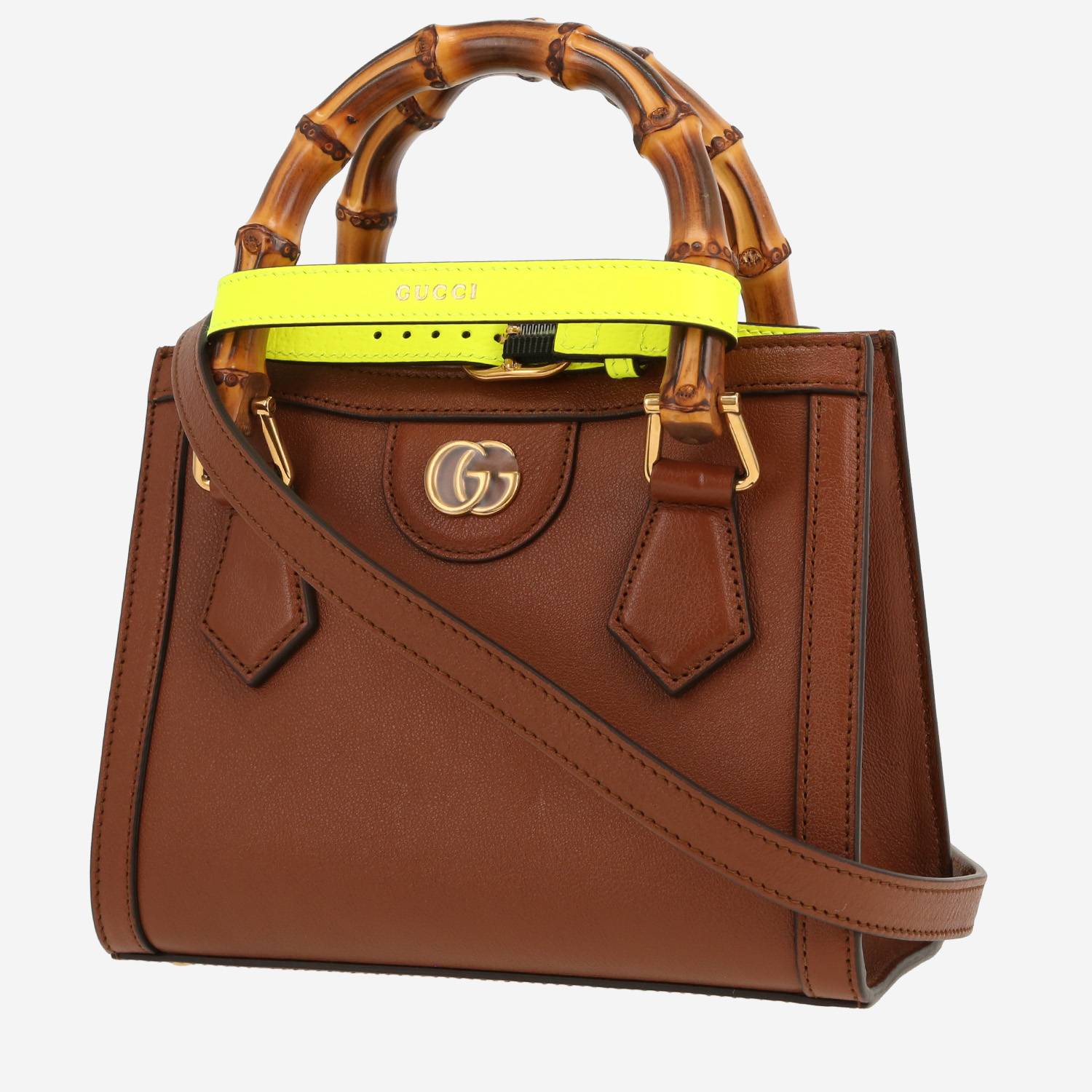 Precioso bolso bandolera Gucci Diana modelo pequeño de cuero marrón, adorno en metal dorado, doble asa de bambú, bandolera de cuero marrón para llevar en la mano o colgado al hombro o cruzado.