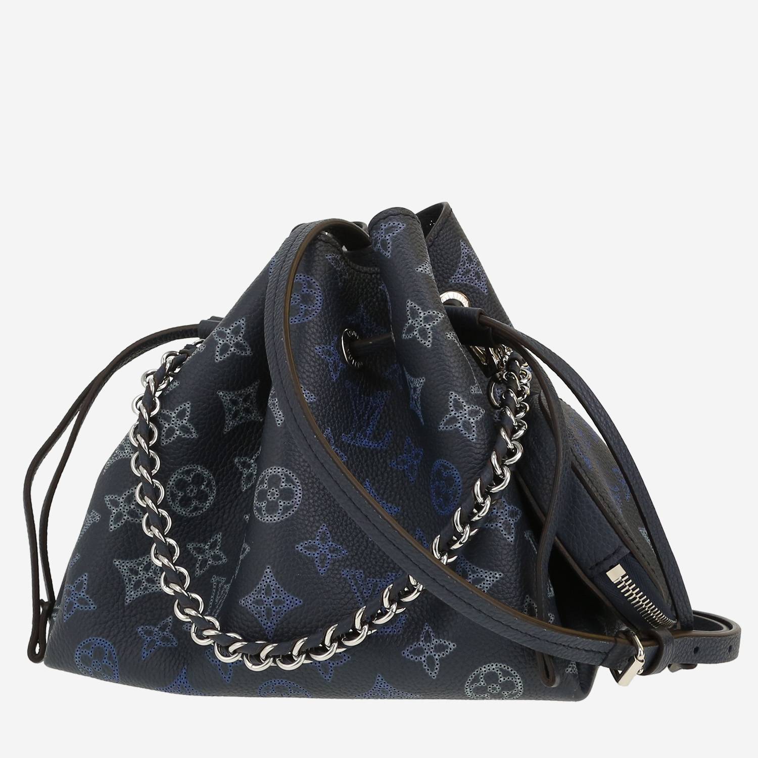 Magnífico bolso para llevar al hombro Louis Vuitton Bella de cuero mahina azul marino y azul claro, adorno en metal plateado, una asa en cadena extraíble de metal plateado entrelazada de cuero azul marino, bandolera extraíble de cuero azul marino para llevar en la mano o al hombro.