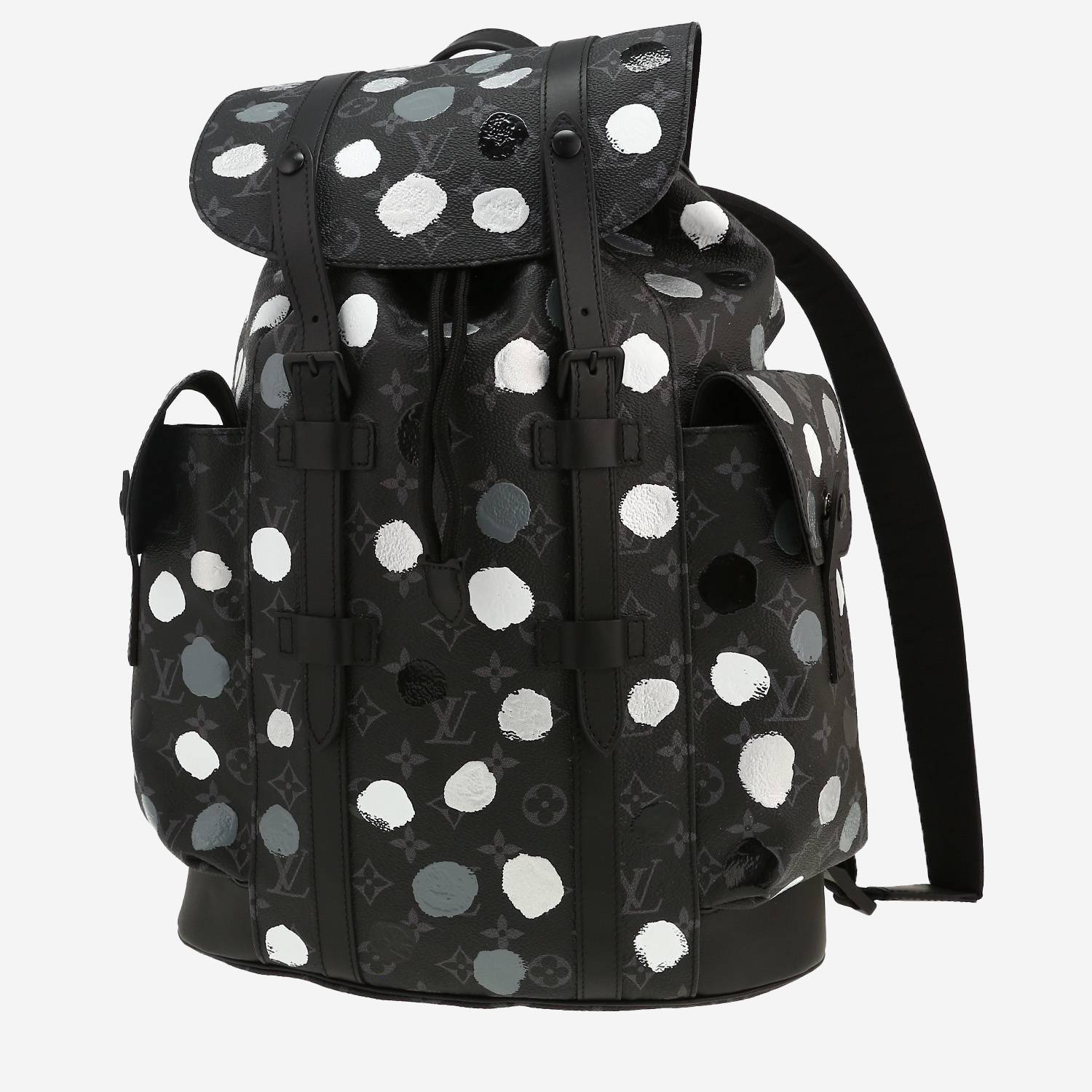 Mochila Louis Vuitton x Yayoi Kusama Christopher de lona Monogram gris de lunares, adorno en metal negro, asa sencilla de cuero negro, doble asa ajustable de tela negra para llevar en la mano.