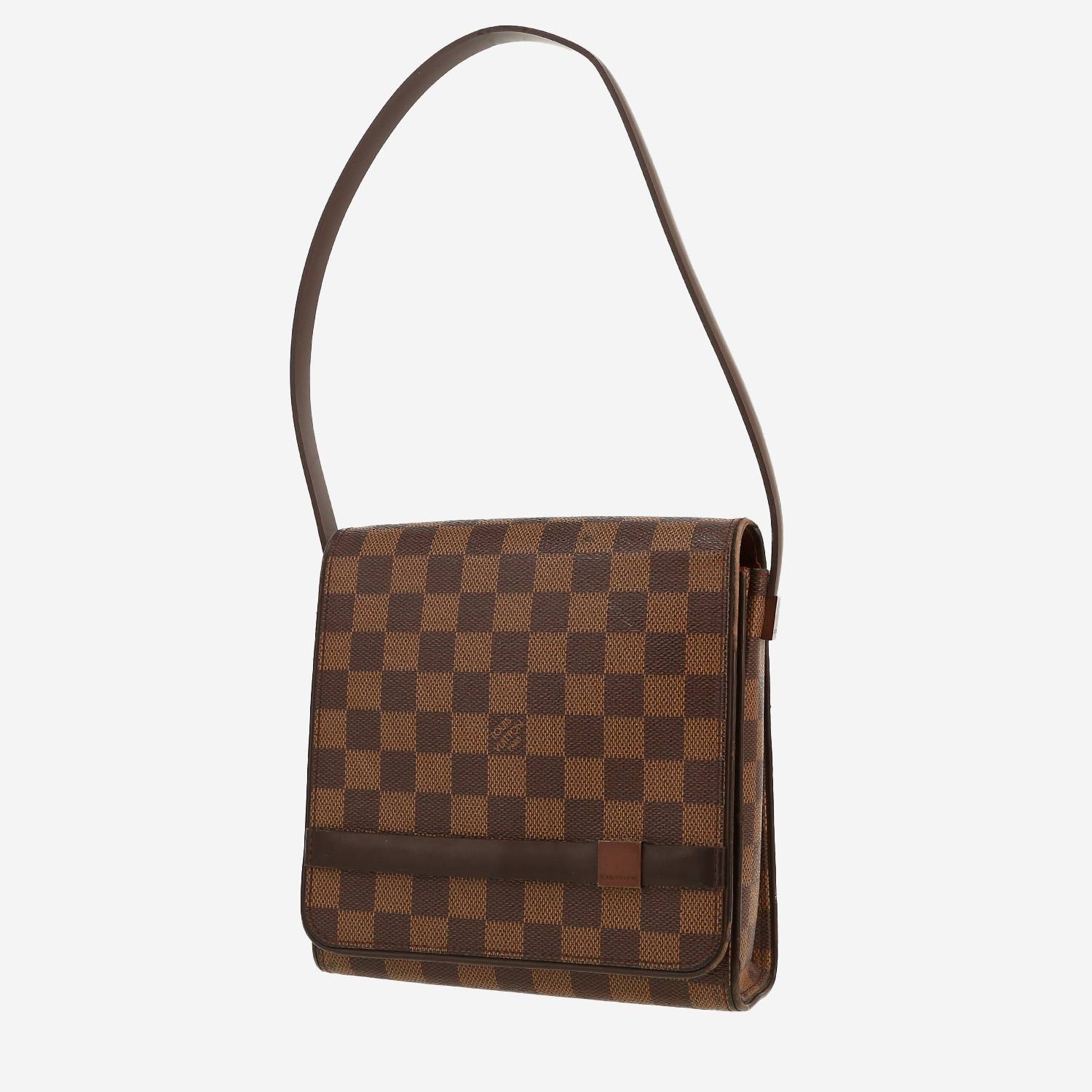 Práctico bolso para llevar al hombro Louis Vuitton Tribeca de lona a cuadros ébano y cuero esmaltado marrón, adorno en metal dorado, una asa de cuero marrón para llevar en la mano o al hombro.