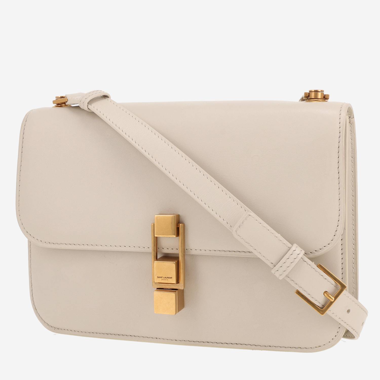 Magnífico bolso bandolera Saint Laurent Carré Satchel de cuero blanco, adorno en metal dorado, una asa de cuero blanco para llevar al hombro o cruzado.