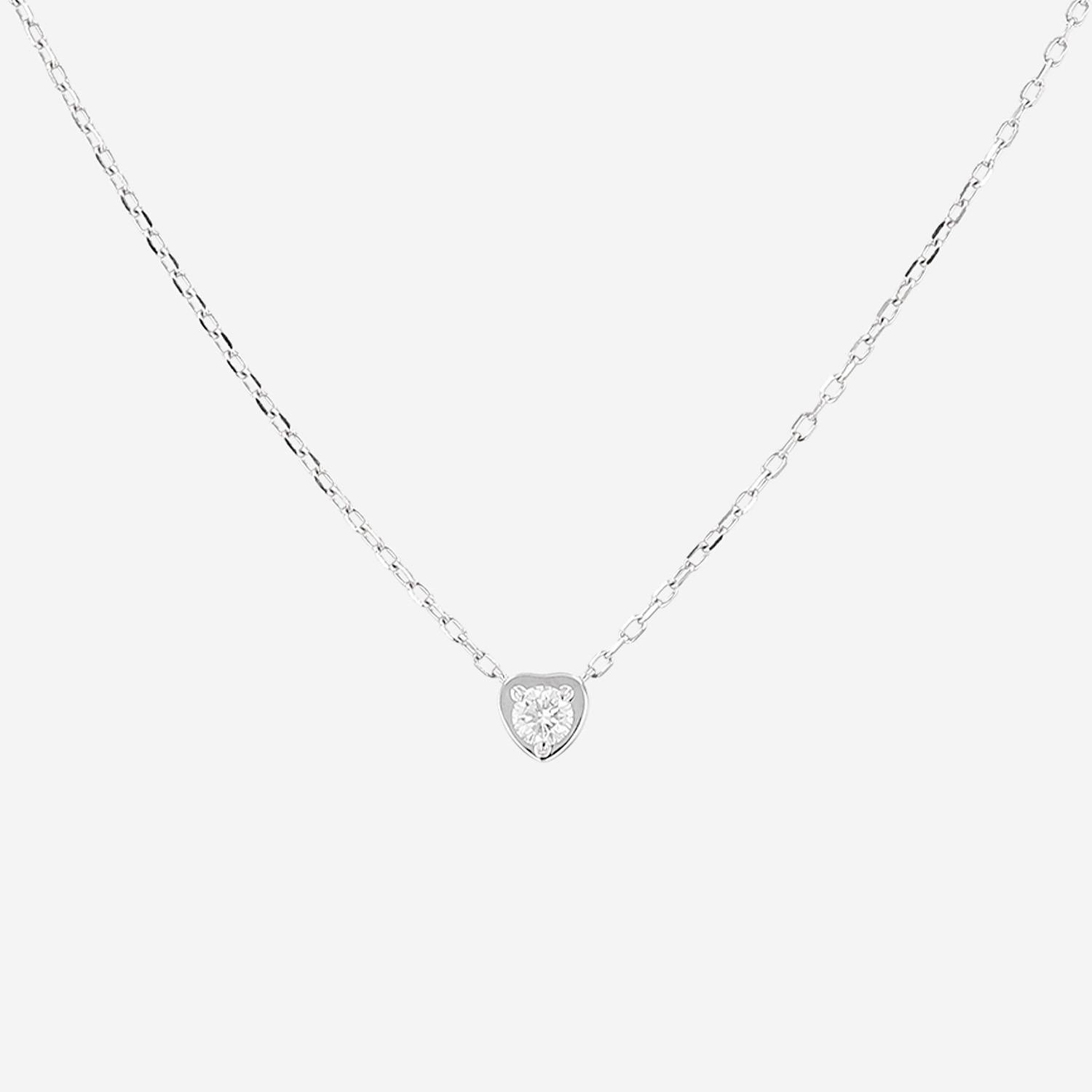 Collar Cartier de oro blanco y diamante, compuesto de un delicado corazón de oro blanco, adornado en el centro de un magnífico diamante de talla brillante pesando de aproximadamente 0.15 quilate, todo ello sujetado por una cadena de eslabones encadenados de oro blanco.