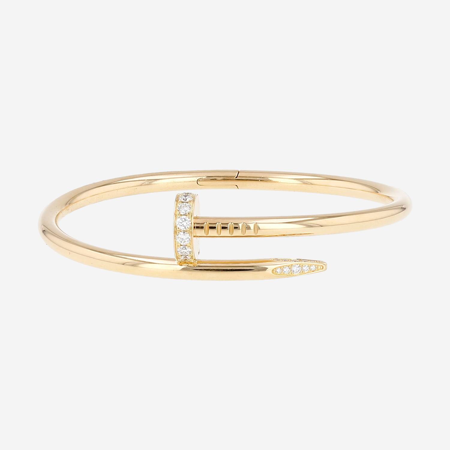 Brazalete Cartier Juste un clou de oro amarillo y diamantes, en el cual figura un sorprendente clavo estilizado parcialmente engastado de diamantes de talla brillante.