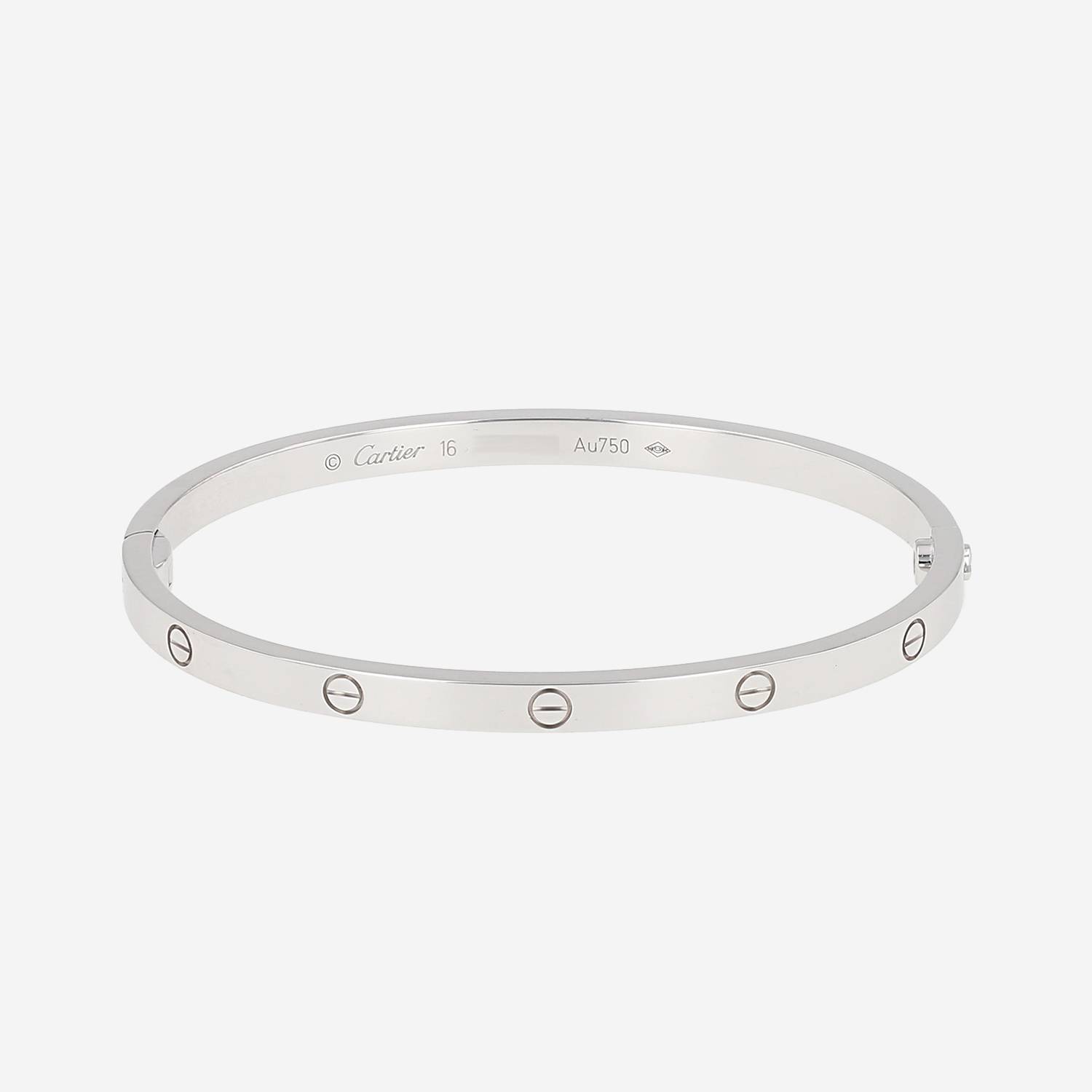 Brazalete Cartier Love modelo pequeño de oro blanco, compuesto de un elegante cinta lisa, adornado de diseños de tornillos grabados.