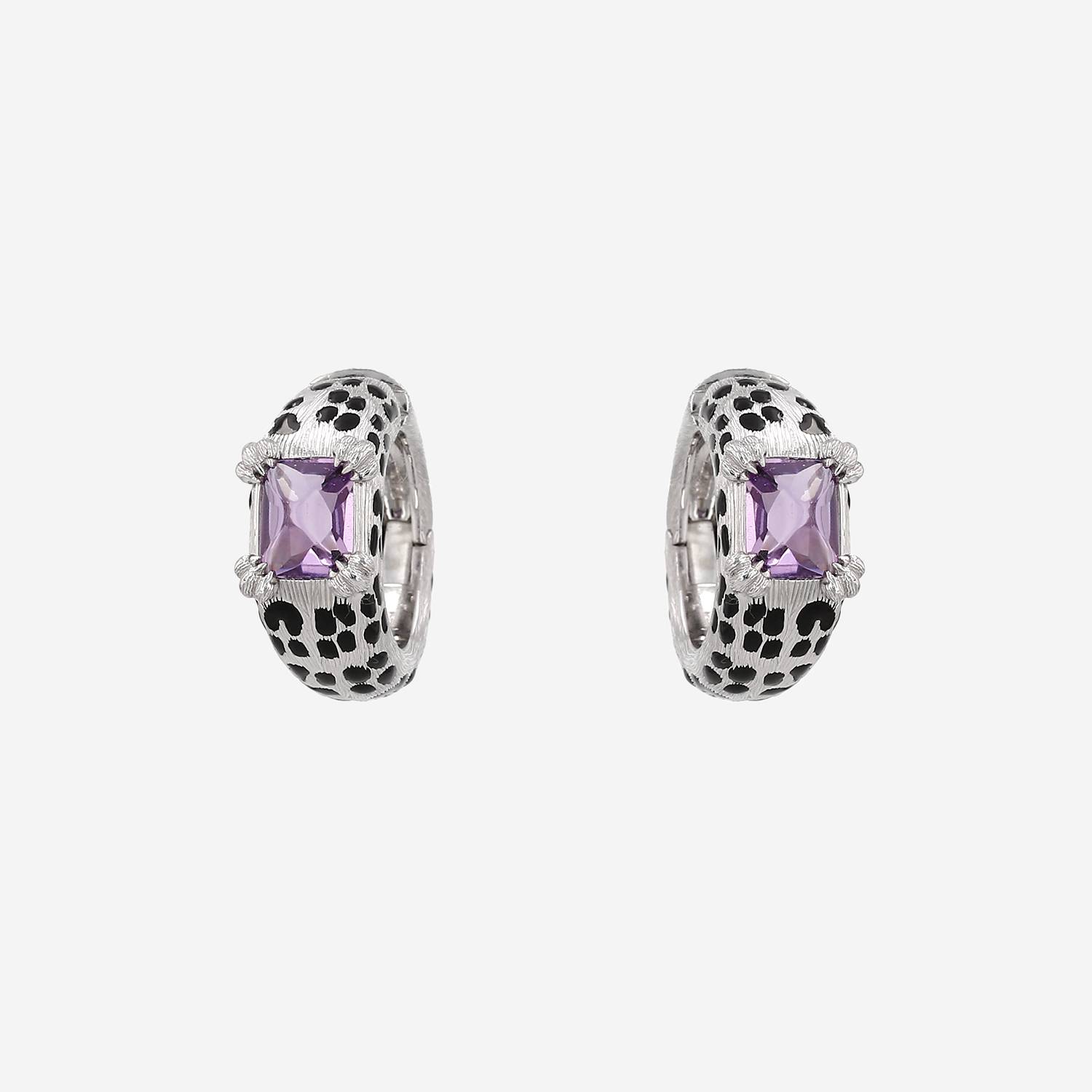 Pendientes Dior Mitzah de oro blanco, de laca negra, y en amatista, en los cuales figura un delicado pelaje de pantera texturado de oro blanco y de laca negra, adornados de un muy bonito cabujón de amatista de talla Pan de Azúcar rodeado de 4 garras de oro blanco.