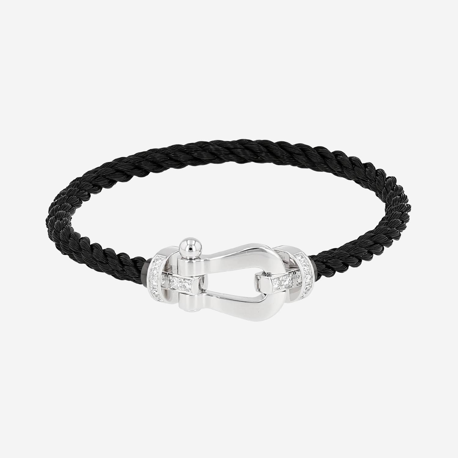 Brazalete Fred Force 10 modelo grande de oro blanco y diamantes, compuesto del intemporal grillete geométrico calado de oro blanco parcialmente engastado de diamantes de talla brillante, realzado de un bonito cable retorcido de nylon negro.