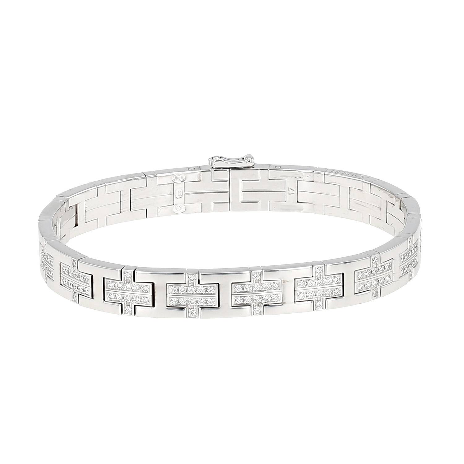 Brazalete Hermès Khilim de oro blanco y diamantes, compuesto de una sucesión de eslabones geométricos semiarticulados de oro blanco parcialmente pavimentados de diamantes de talla brillante de 1.45 quilate en total.