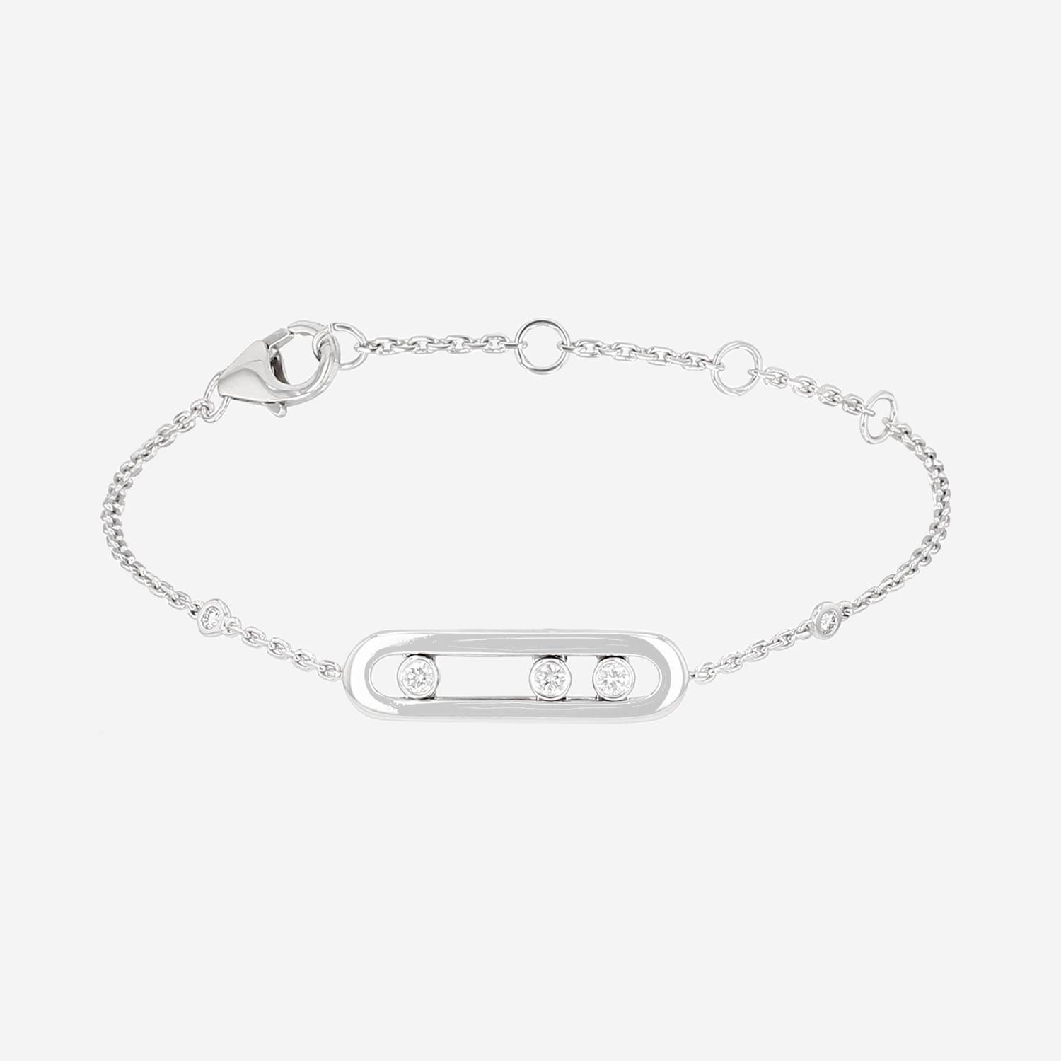 Brazalete Messika Baby Move de oro blanco y diamantes, compuesto de un diseño ovalado calado de oro blanco, que sujeta en el centro pequeños diamantes movibles, realzado de una cadena de eslabones encadenados de oro blanco engastada cerrado de 2 diamantes.