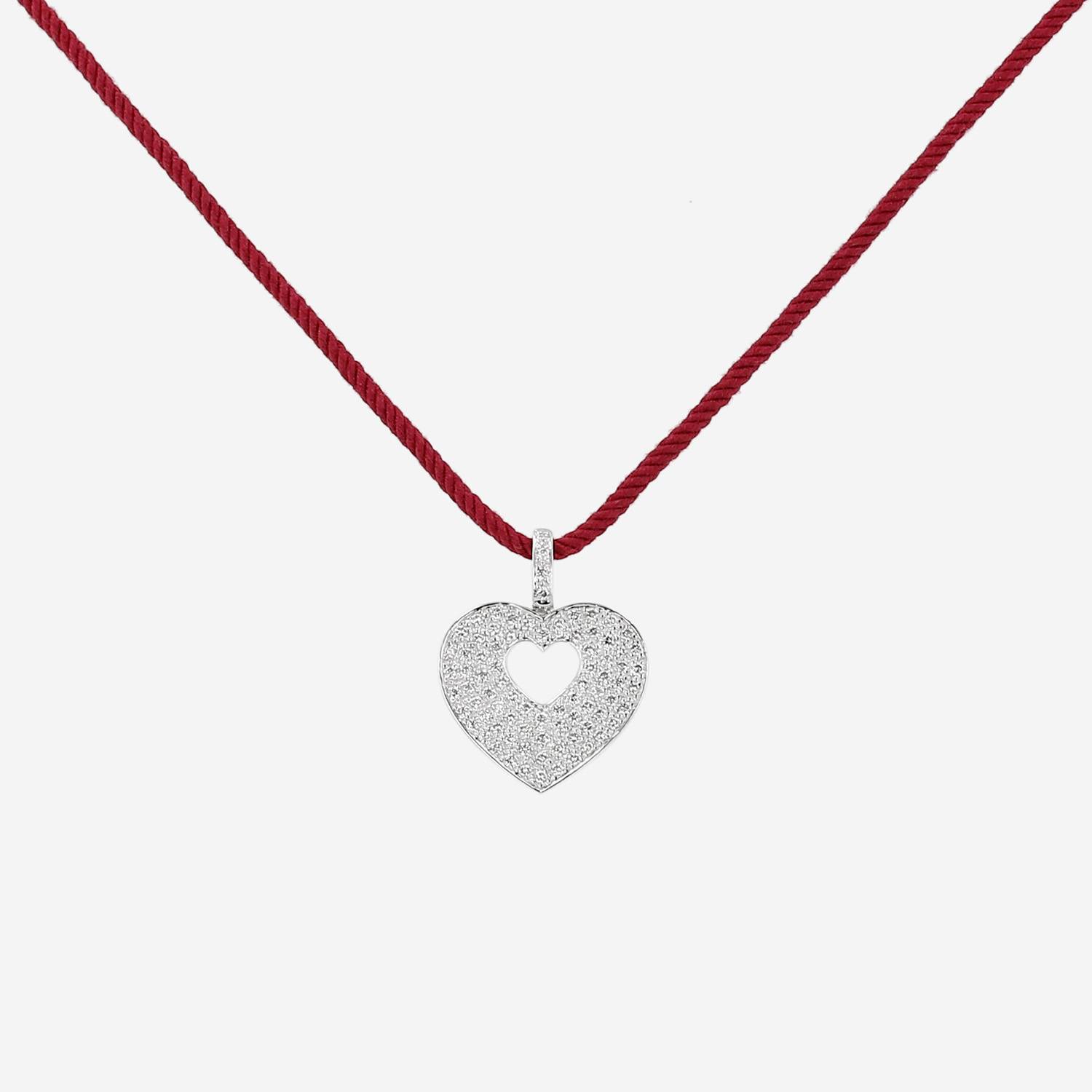 Colgante Poiray Coeur Secret de oro blanco y diamantes, compuesto de un precioso corazón calado de oro blanco delicadamente engastado de diamantes de talla brillante 1.26 quilate de en total, sujetado por un muy bonito cordón retorcido.